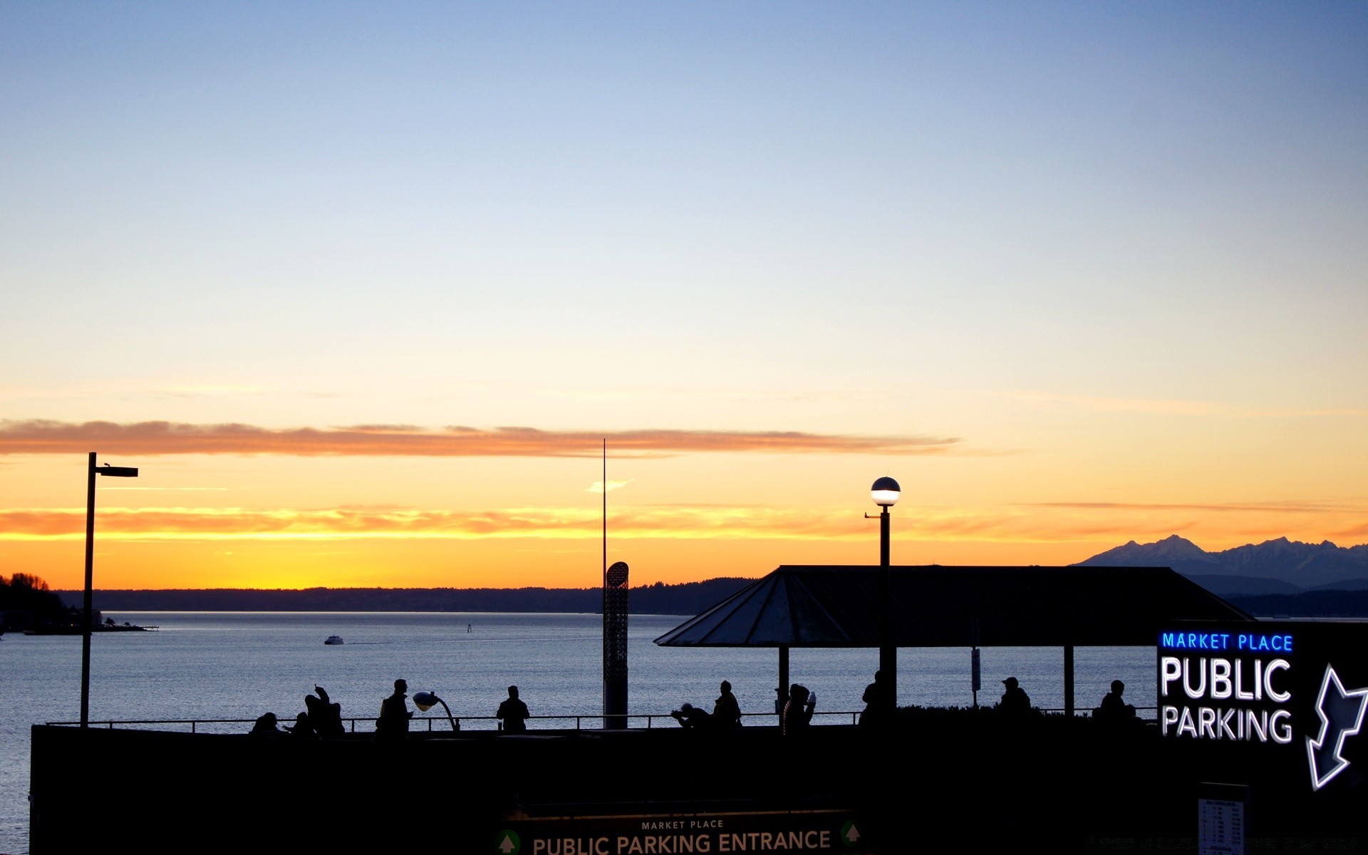 Coucher de soleil sur la jetée avec des silhouettes de personnes