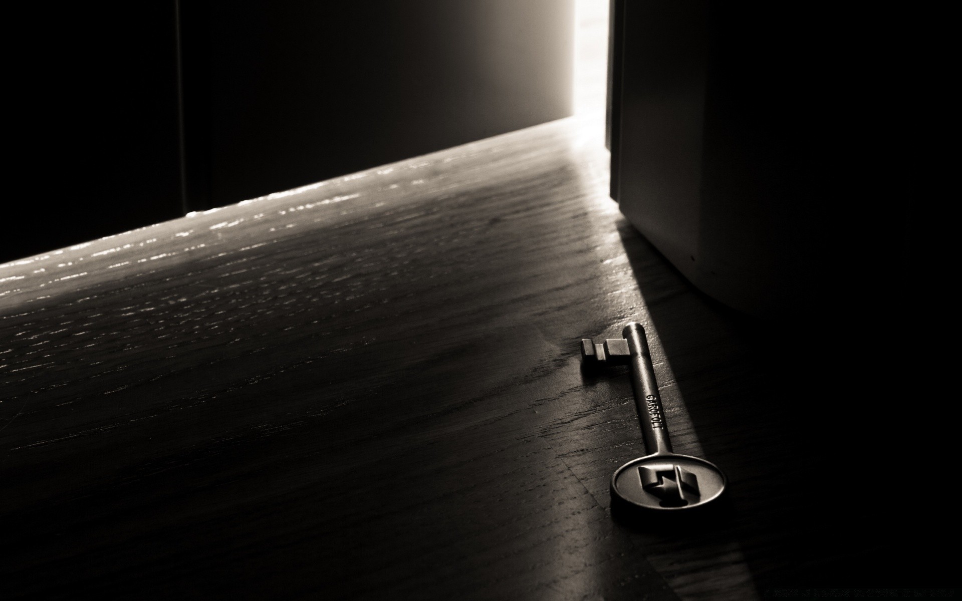Clé en métal couché sur le sol devant une porte légèrement ouverte