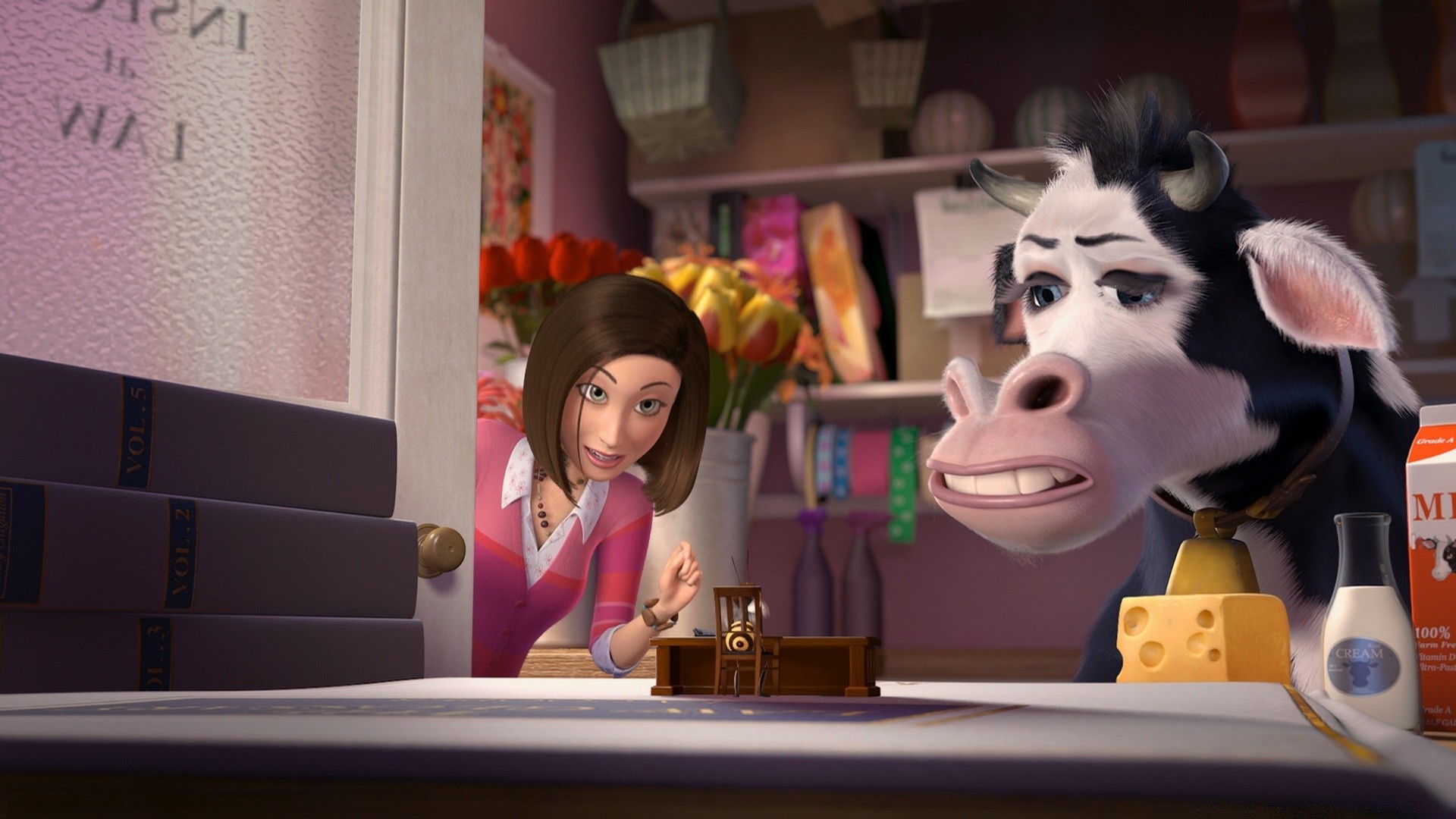 Femme avec une vache à l'intérieur. Dessin animé