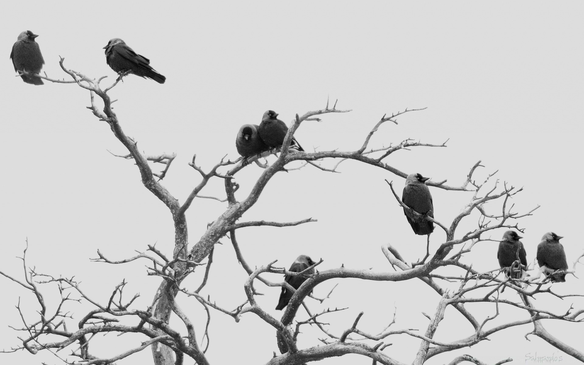 Beaucoup d'oiseaux sont assis sur un arbre sans feuilles