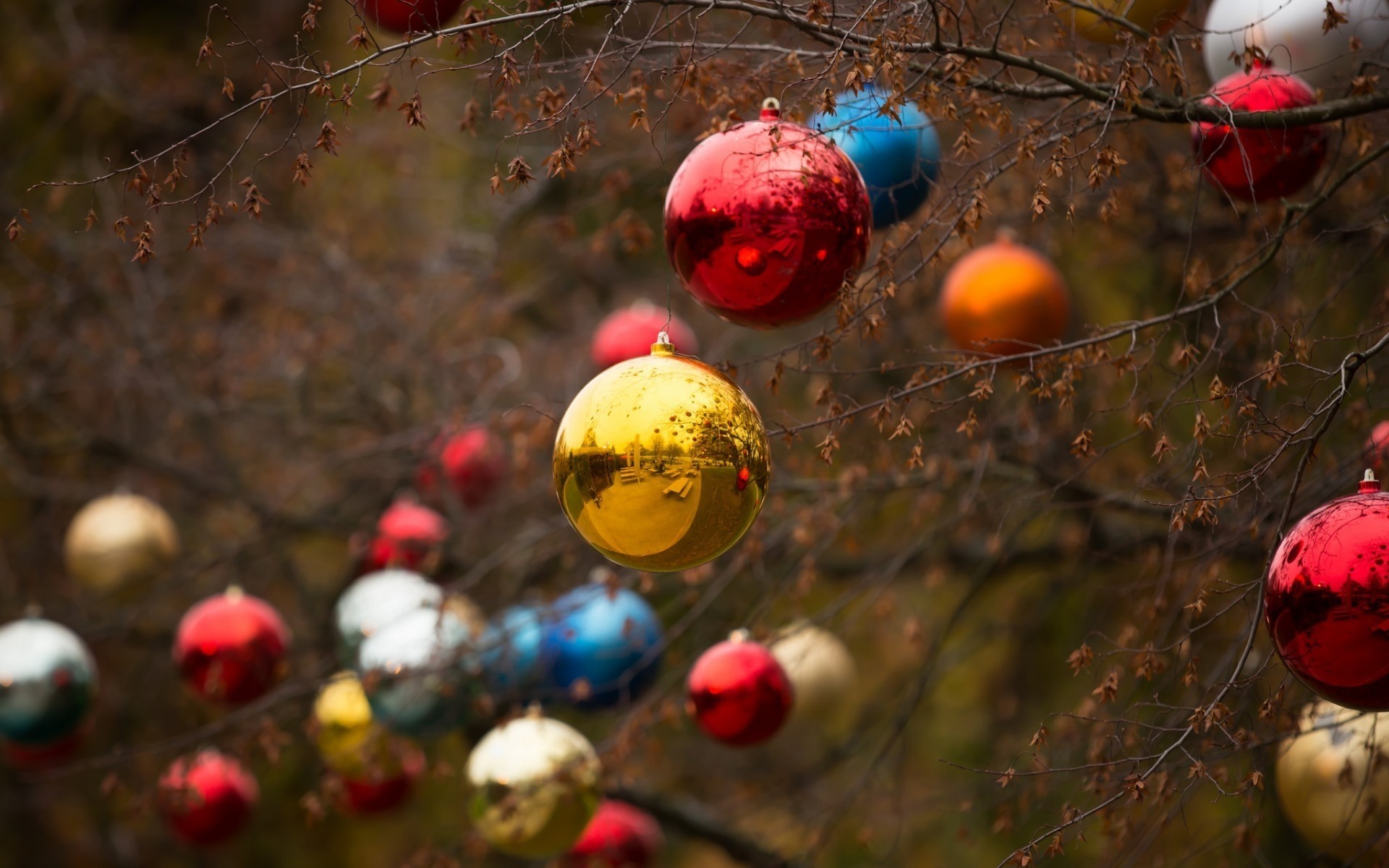 Jouets de Noël sur les branches d'un arbre d'automne