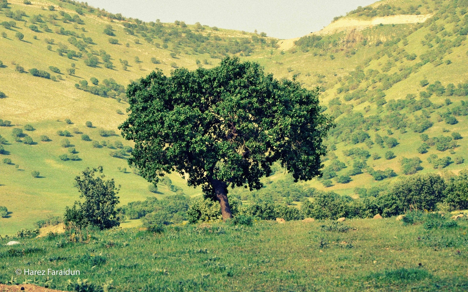 Arbre en fleurs entre deux collines