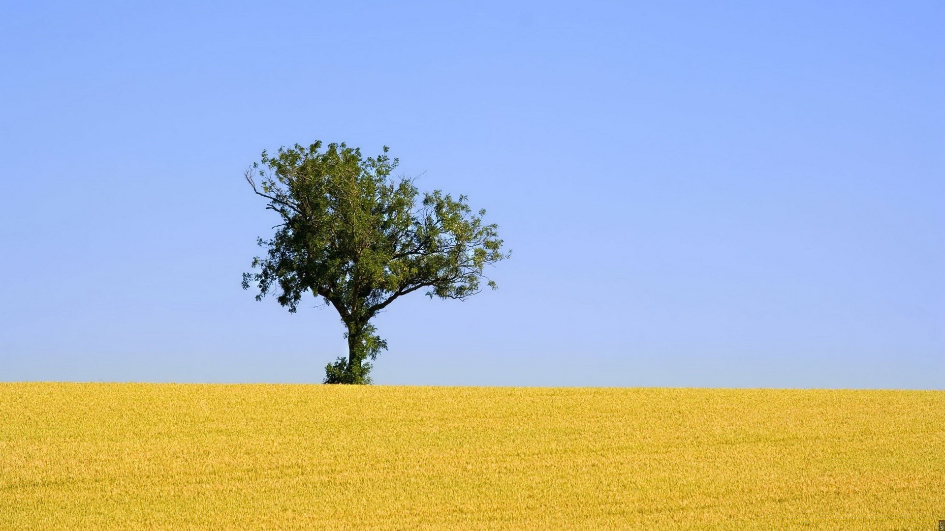 Paysage avec un arbre dans un champ jaune sous un ciel bleu