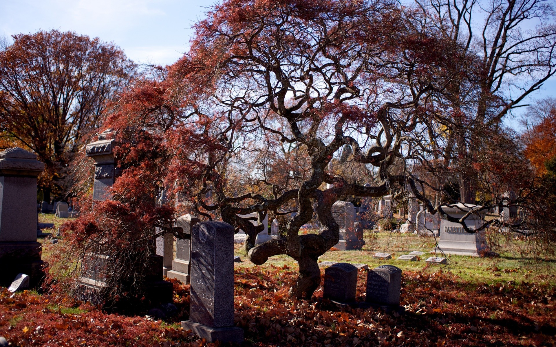Arbre de plus en plus dans le cimetière parmi les tombes