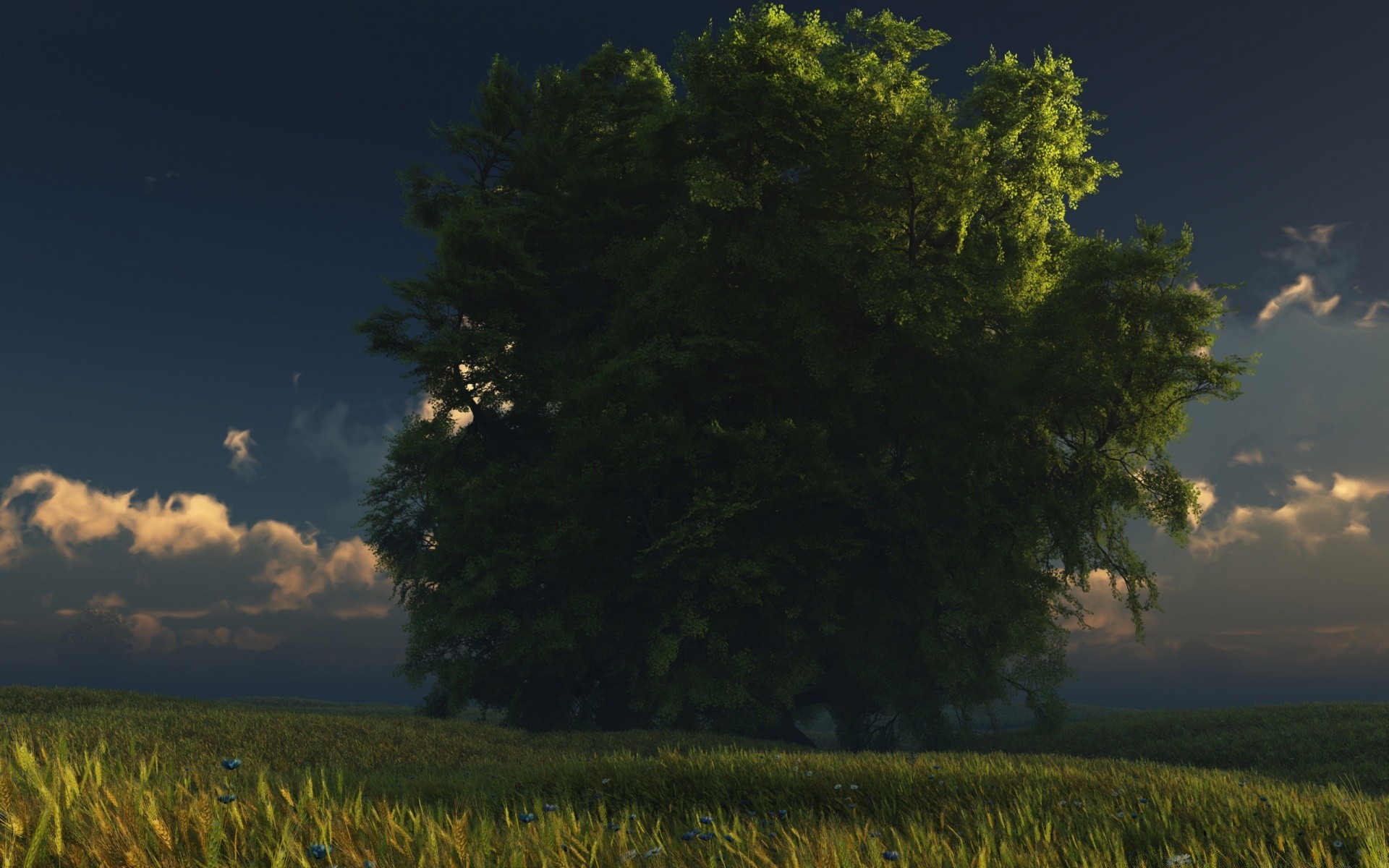Arbre solitaire au milieu d'une Prairie verte sur fond de ciel bleu