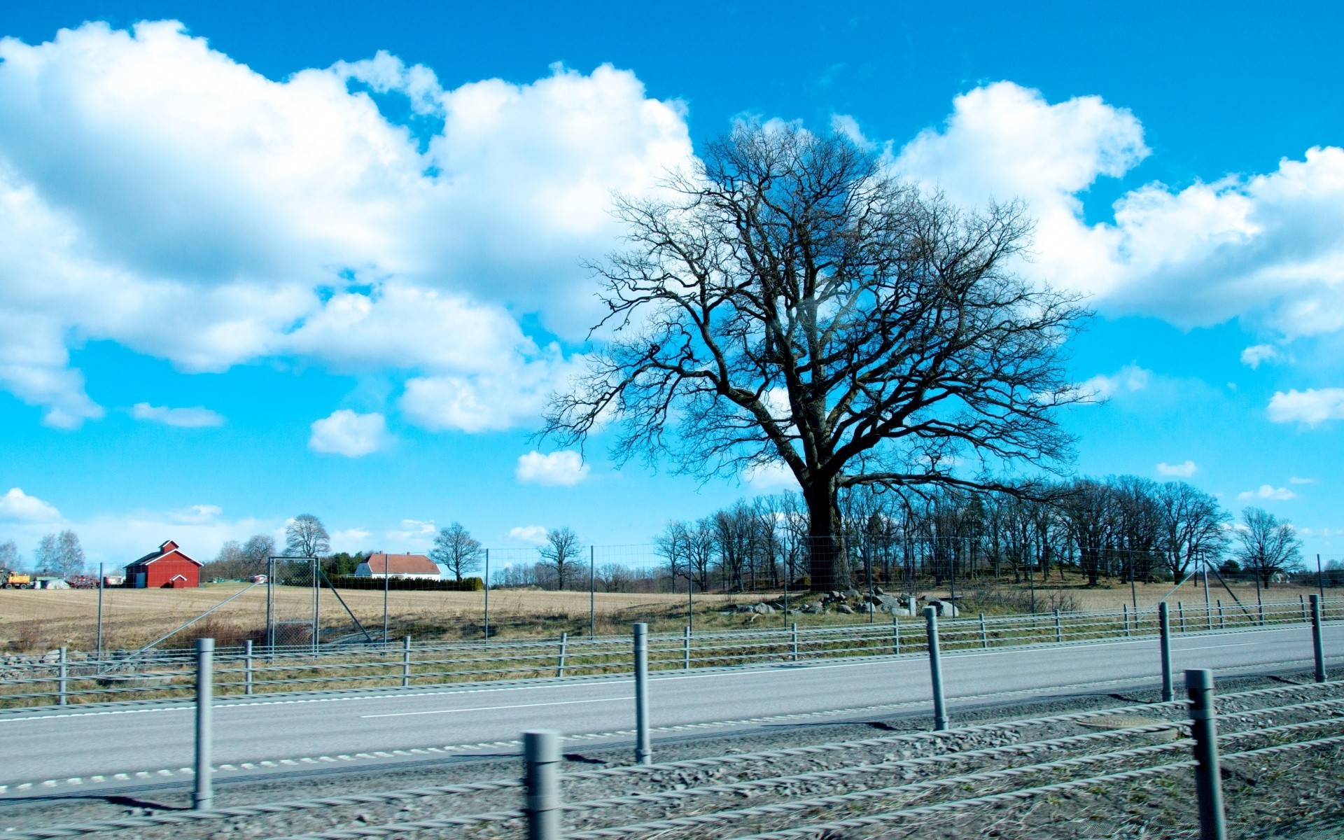 Arbre sur fond de nuages et de champs