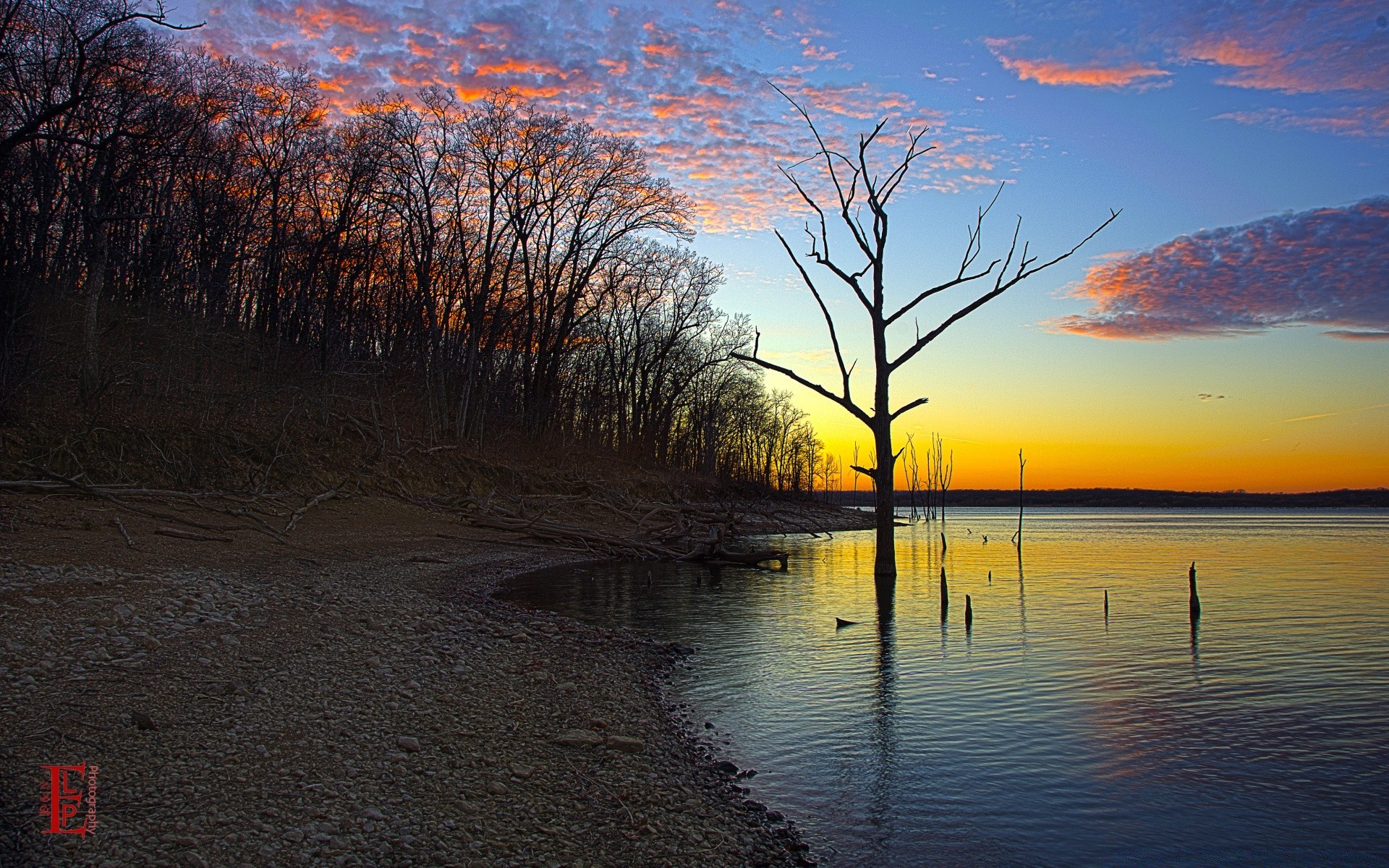 Arbre sec sur le fond d un beau coucher de soleil sur un plan d eau dont la côte est bordée d arbres paros