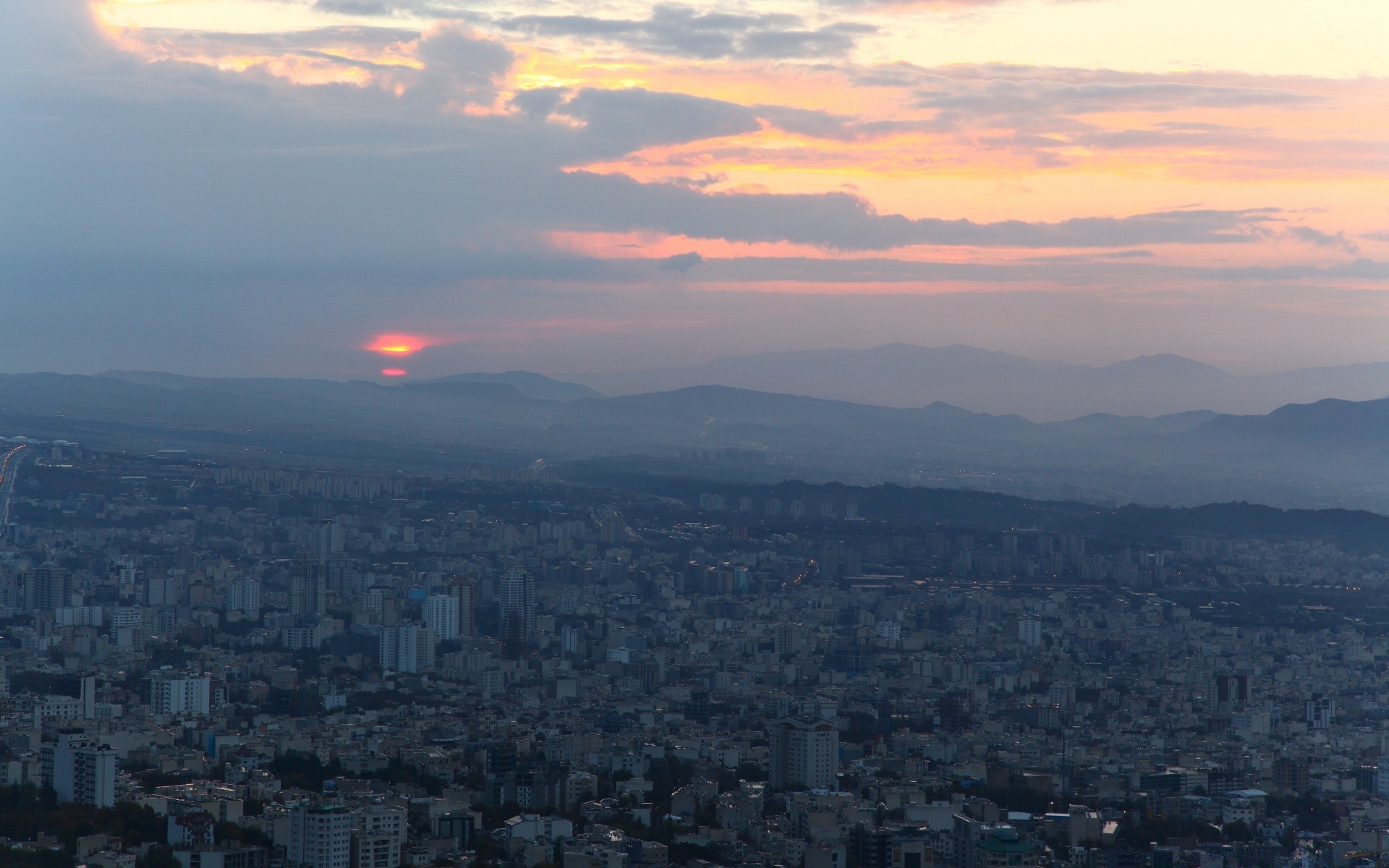 Coucher de soleil brumeux dans les montagnes de l'Asie