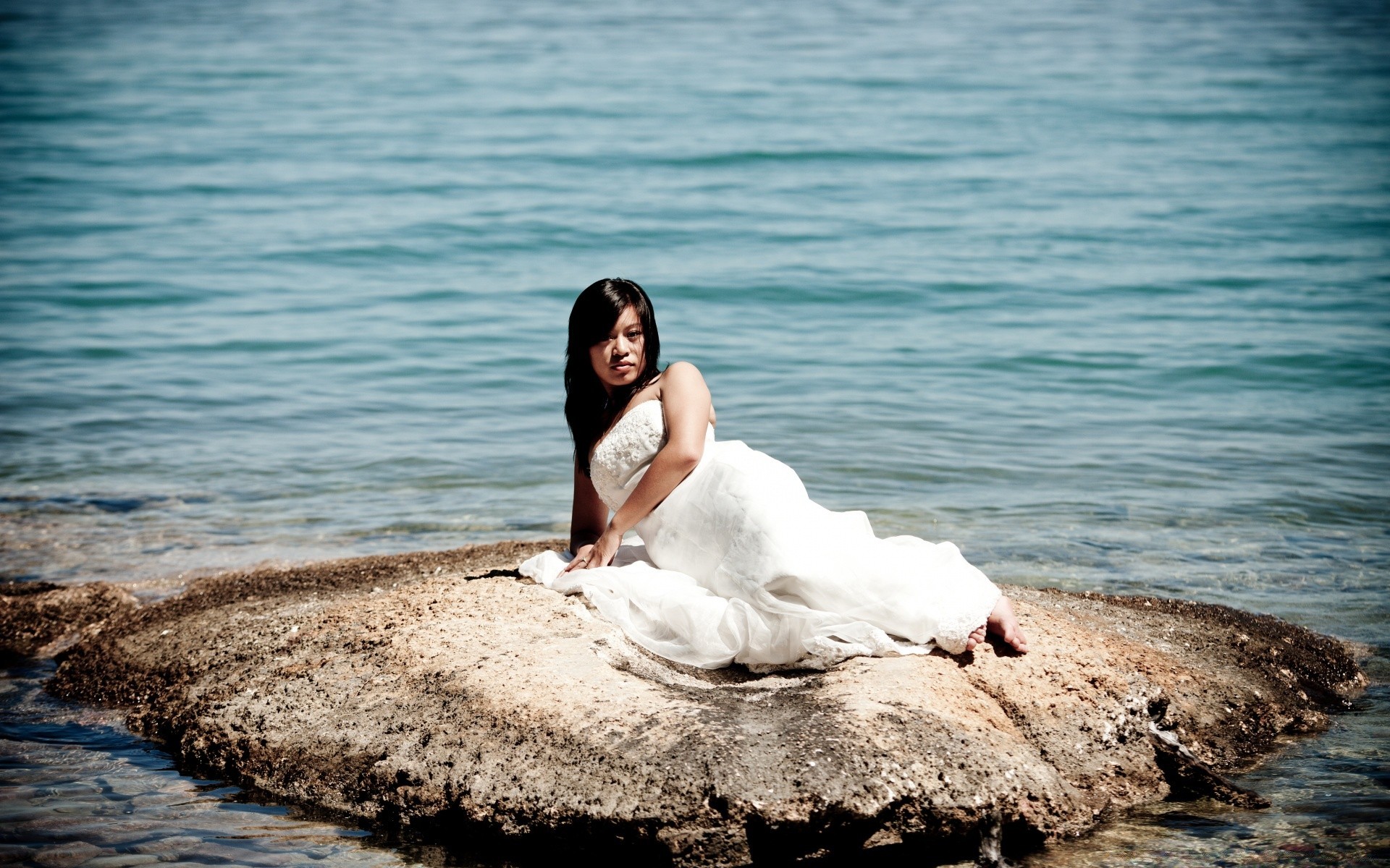 Fille en maillot de bain posant assis dans l'eau