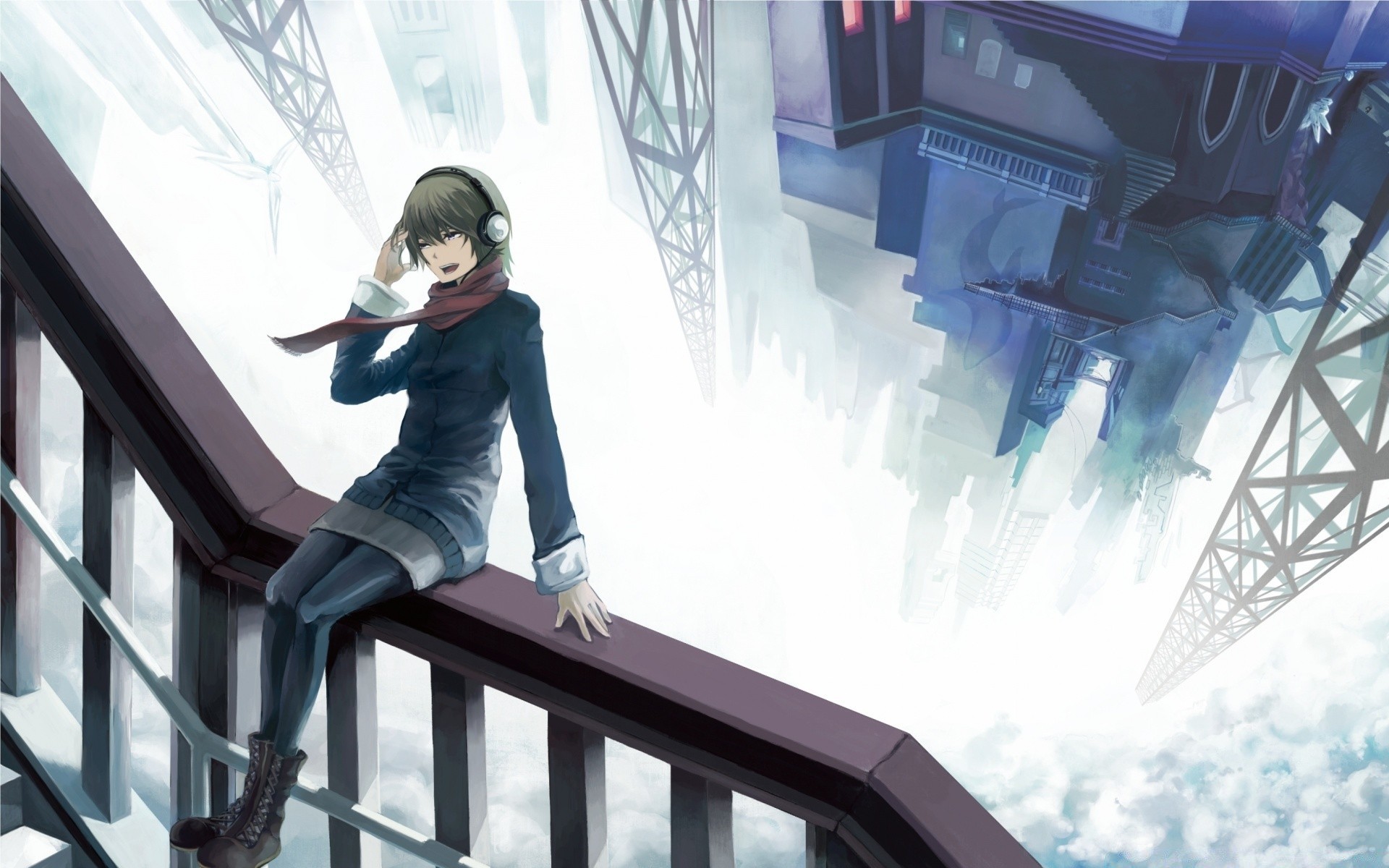Anime girl dans un casque assis sur la rampe sur le fond des progrès technologiques