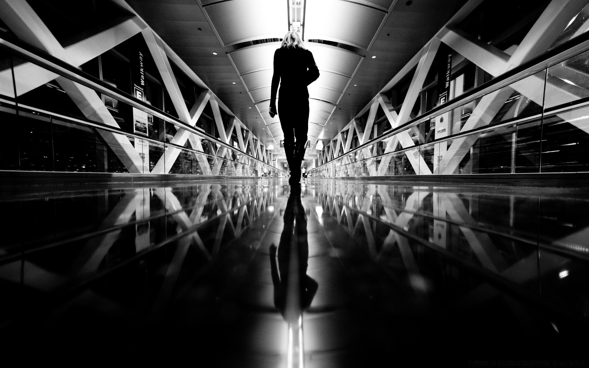 Photo en noir et blanc d'une jeune fille marchant sur l'aéroport