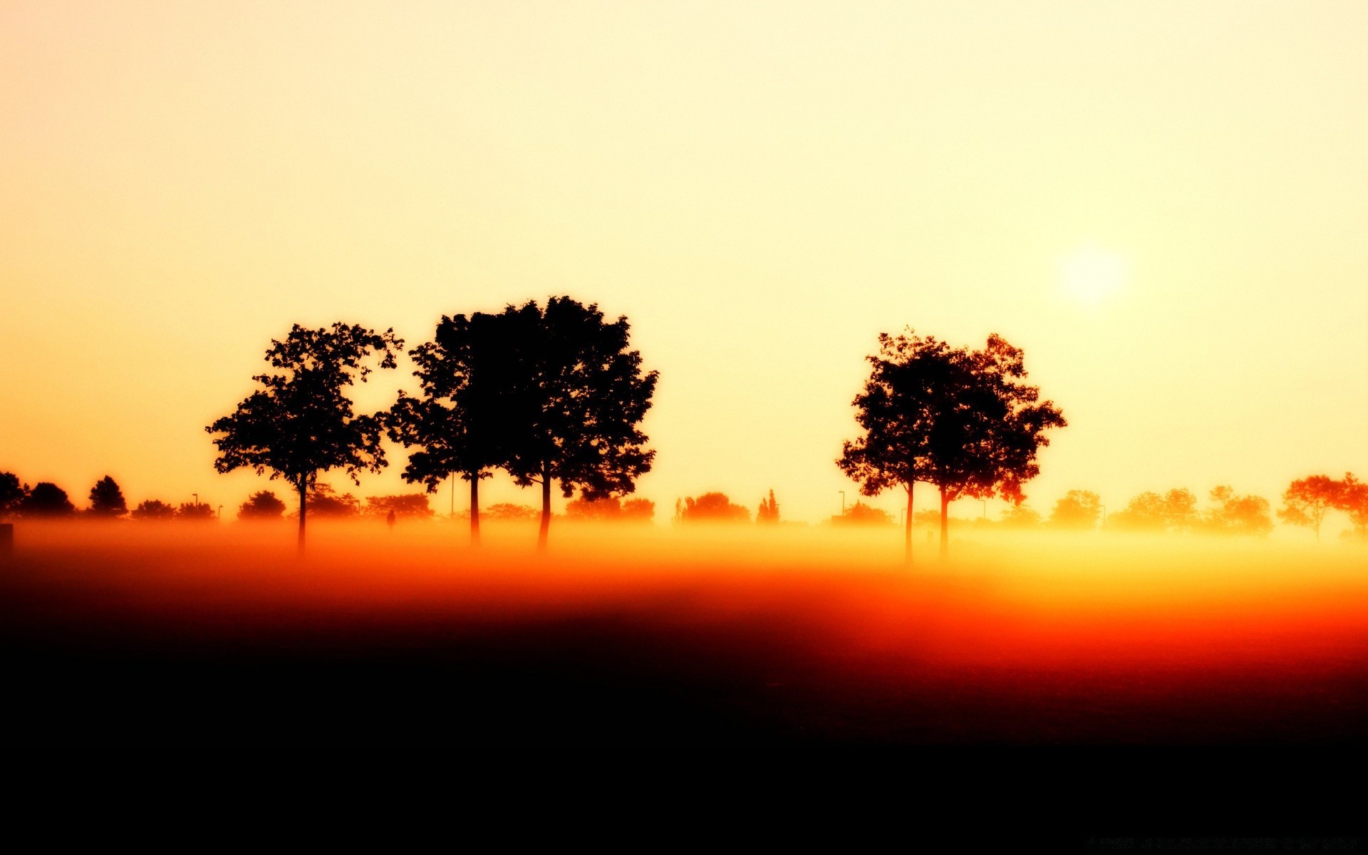 Brume au coucher du soleil se fraye un chemin à travers les arbres