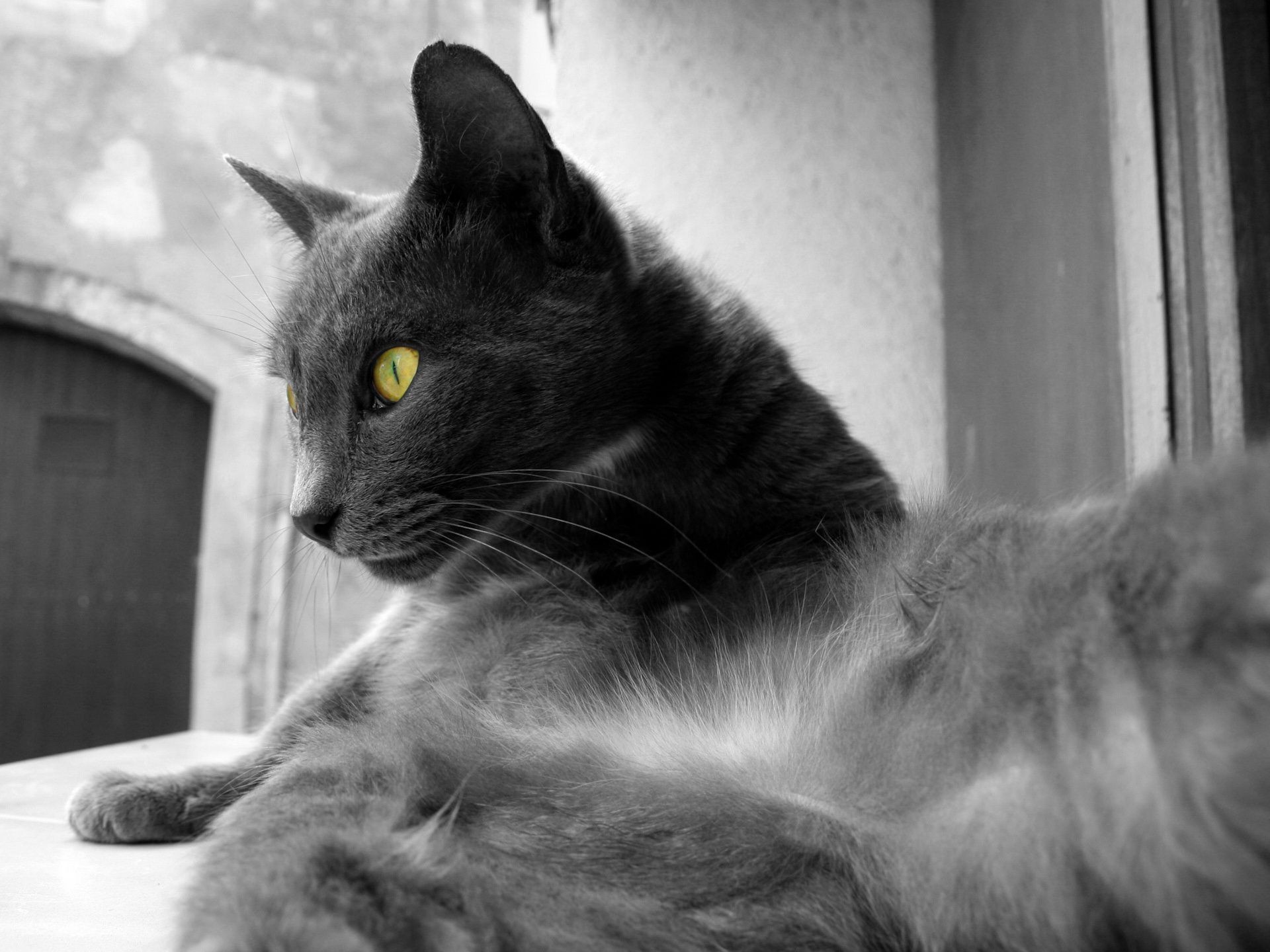 Photo noir et blanc représentant un Lynx d'hiver sur fond de maison et arbre