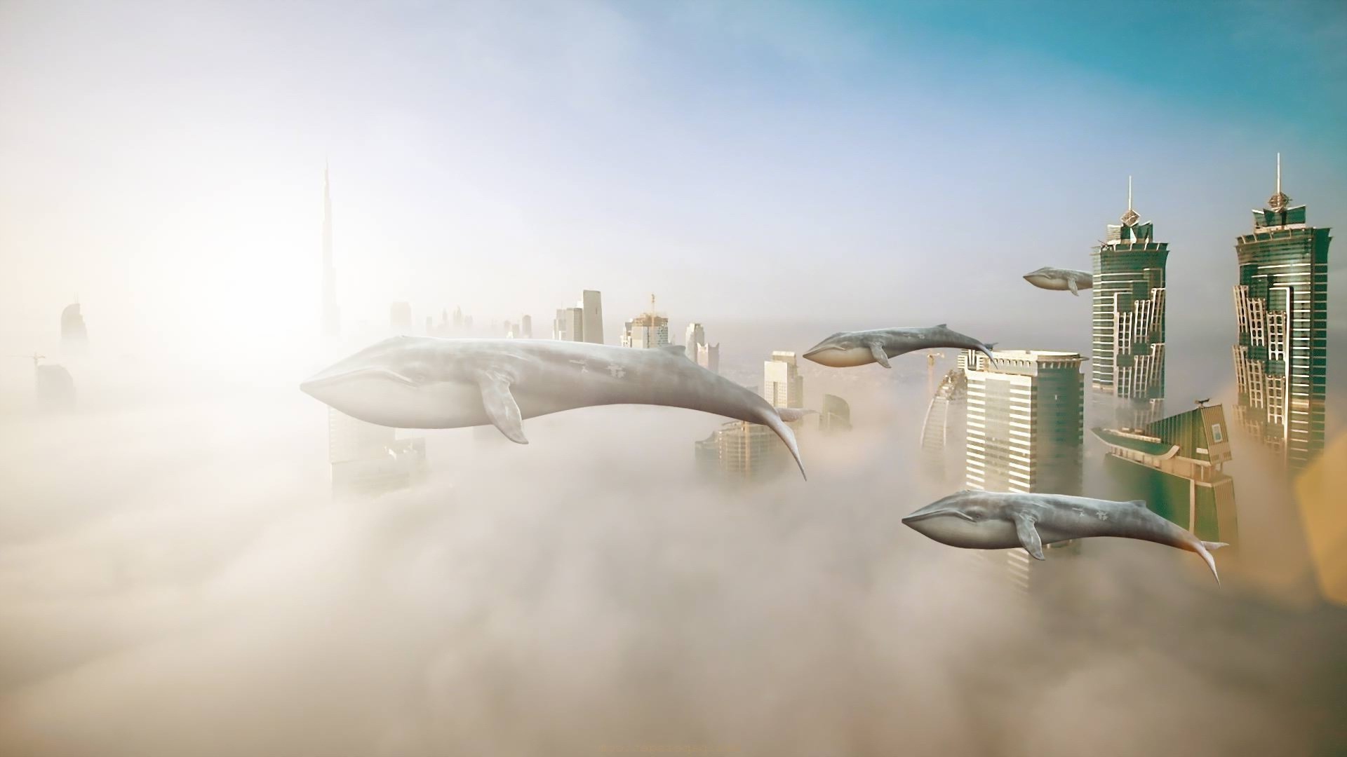 Baleines nageant dans le ciel au-dessus de la villeBaleines nageant dans le ciel au-dessus de la ville