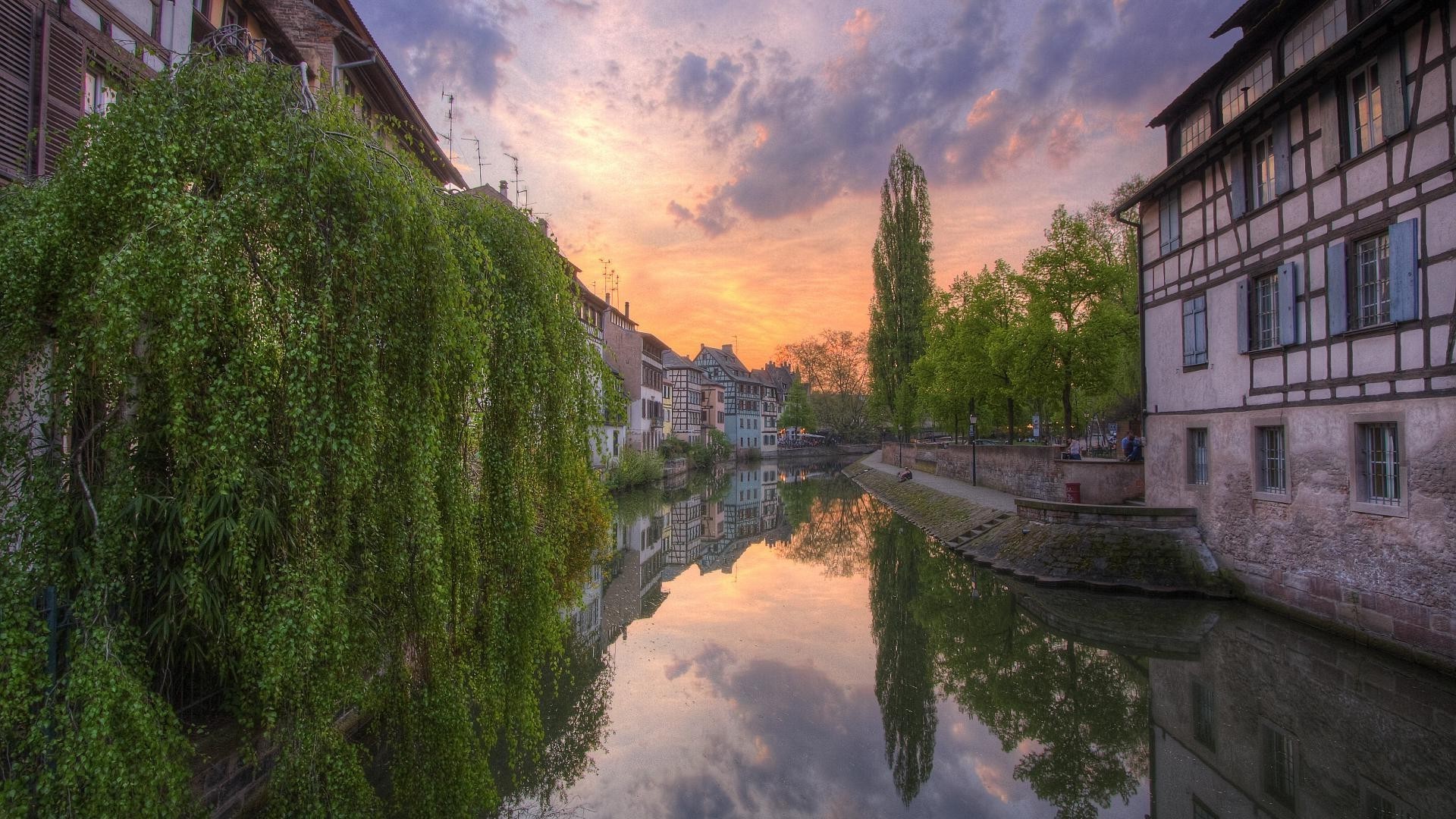 Canal dans la ville entre les maisons au coucher du soleil