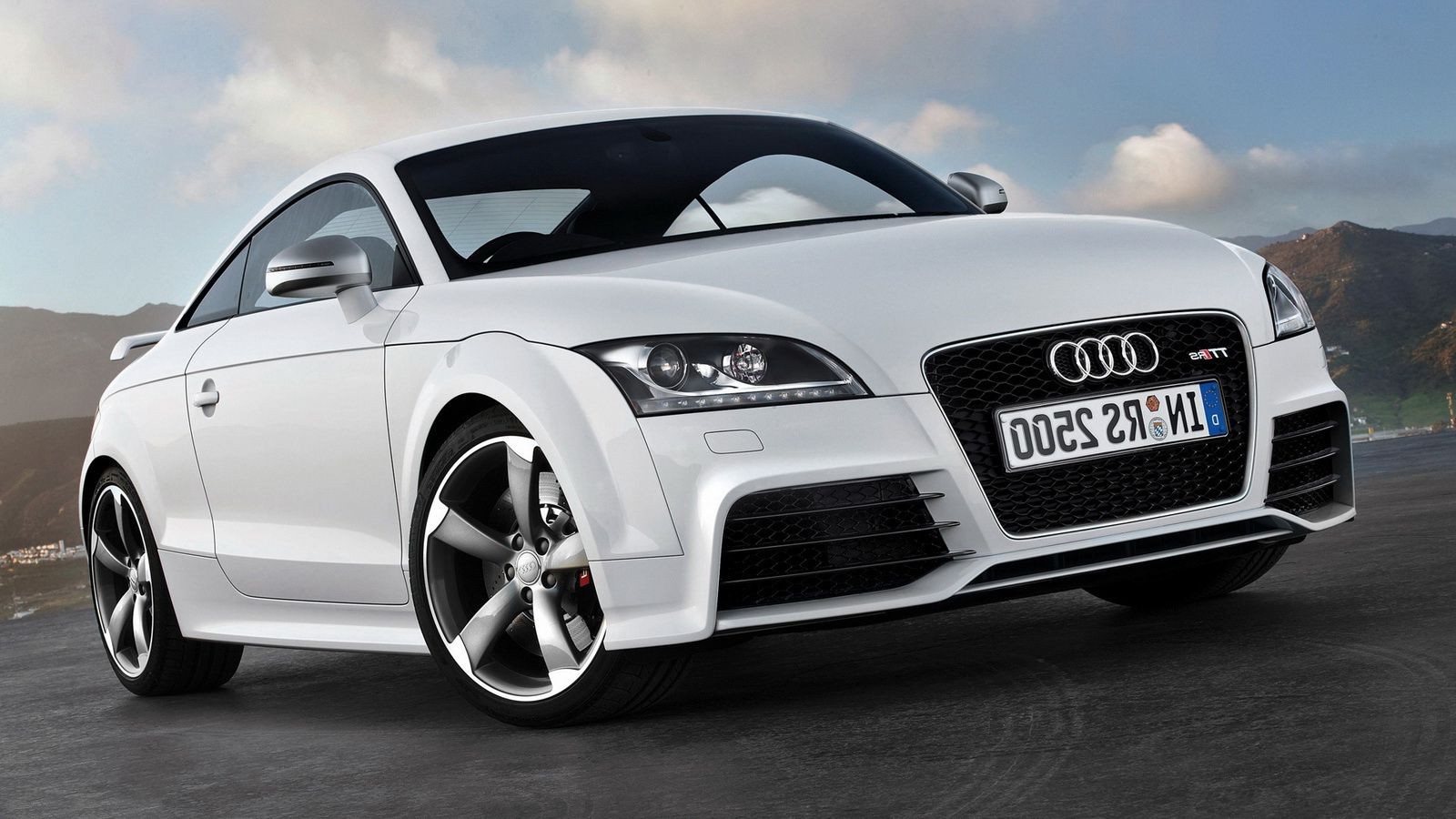 Voiture de couleur écarlate "AUDI" devant le sommet de la montagne