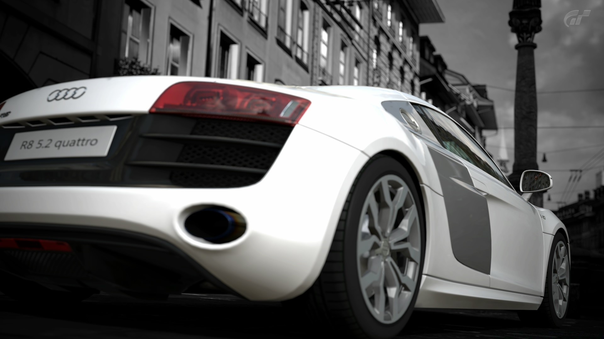 Blanc Audi R8 quattro sur fond de ville nuageuse dans le jeu d'ordinateur gran turismo
