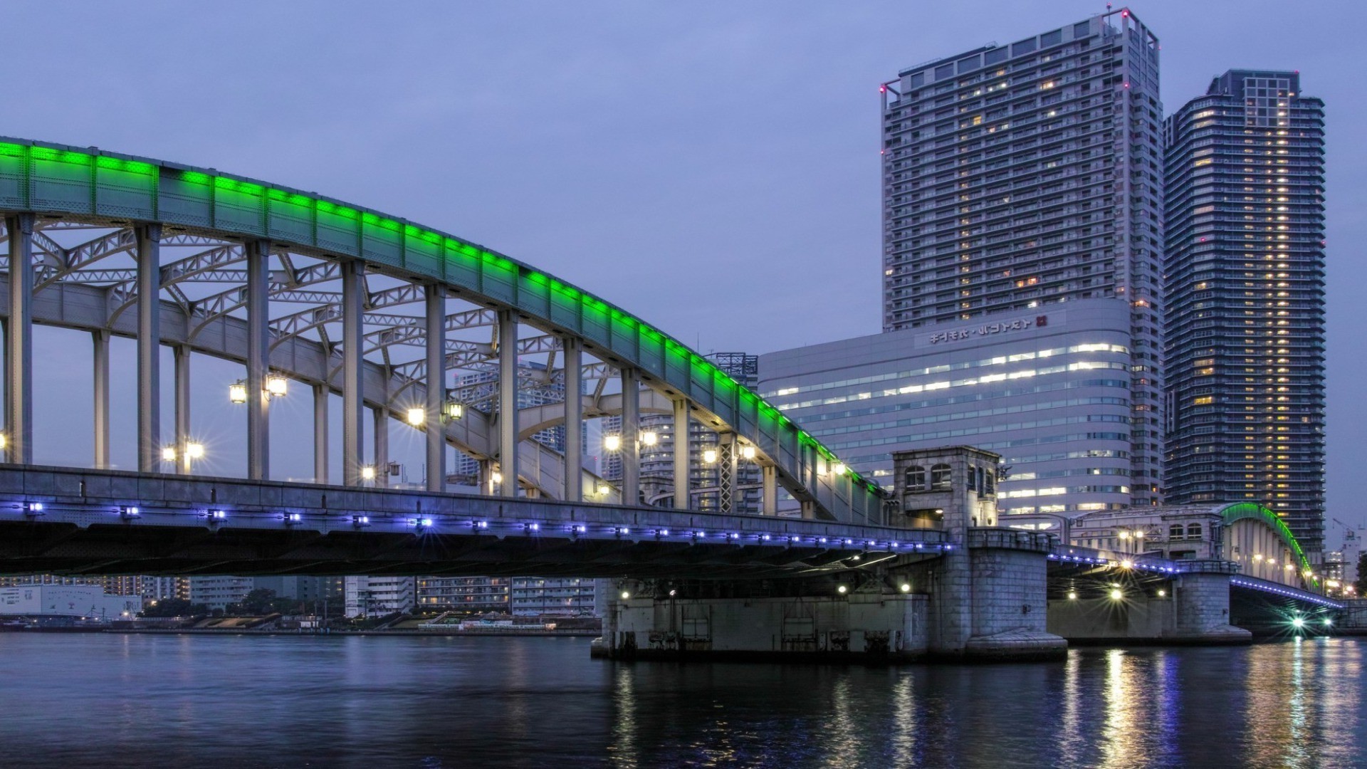 Pont suspendu sur la rivière sur fond de gratte-ciel