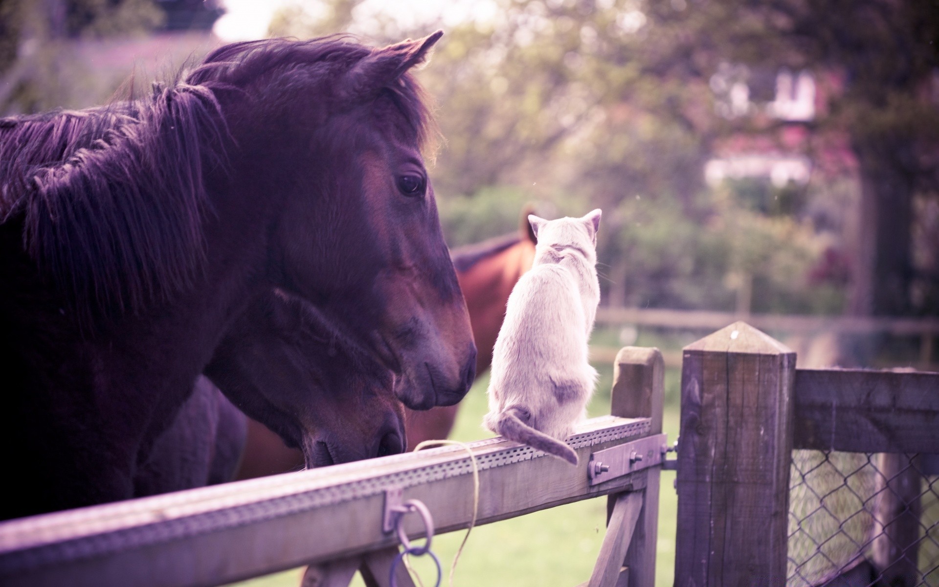 Les chevaux dans l'enclos communiquent avec le chat blanc