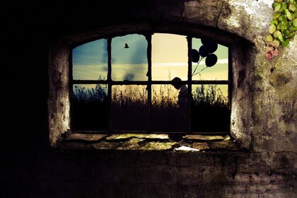 Vue de la fenêtre d'un bâtiment abandonné de l'architecture mystèreVue de la fenêtre d'un bâtiment abandonné de l'architecture mystère
