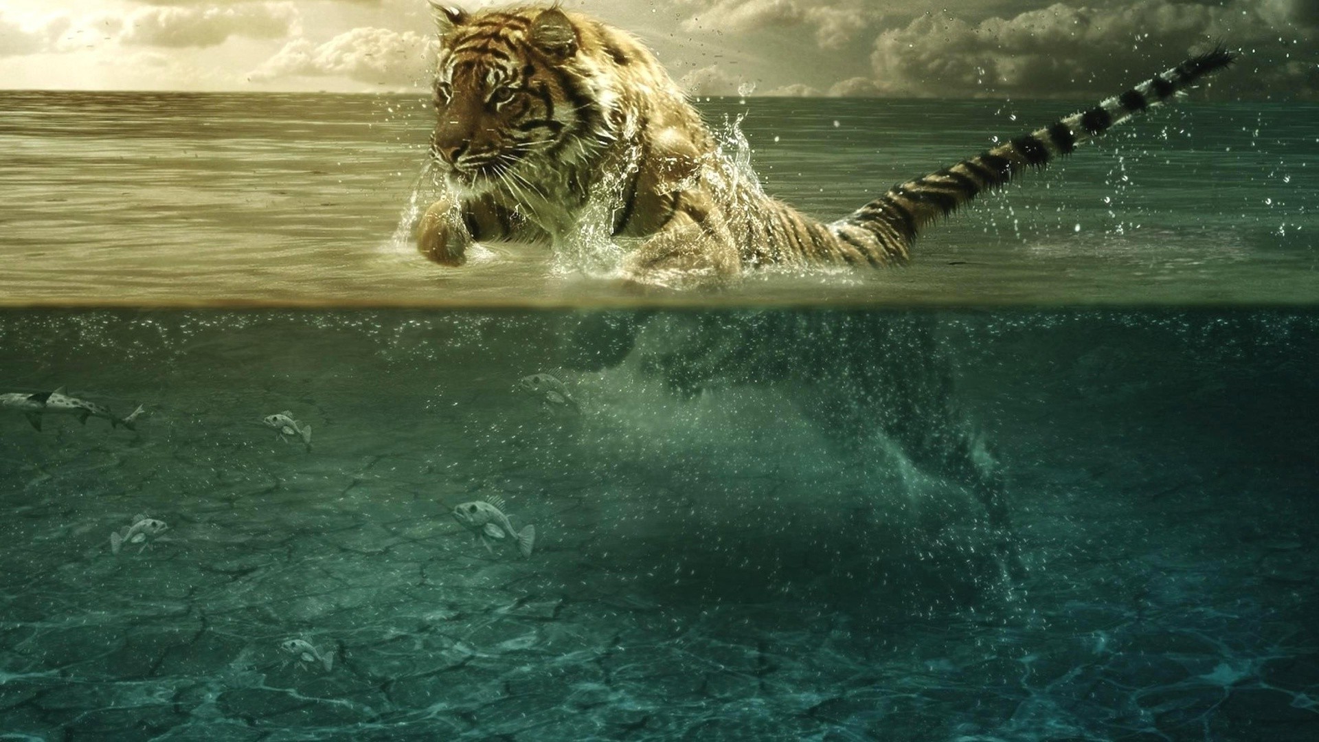 Le tigre saute hors de l'eau et soulève les éclaboussures