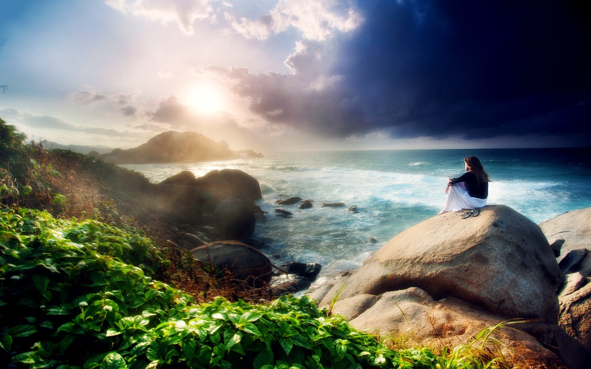 Jeune fille debout sur le bord de la plate-forme d'observation dans les montagnes