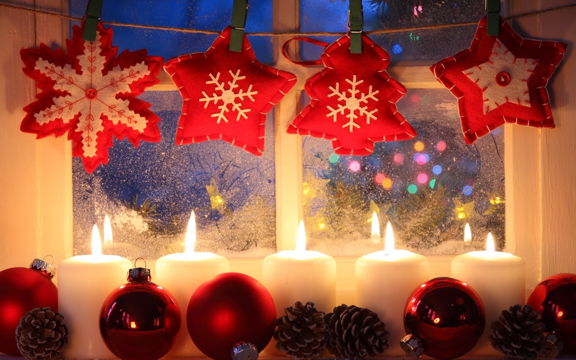 Trois bougies rouges ornées d'un arc de cadeau et de branches de sapin