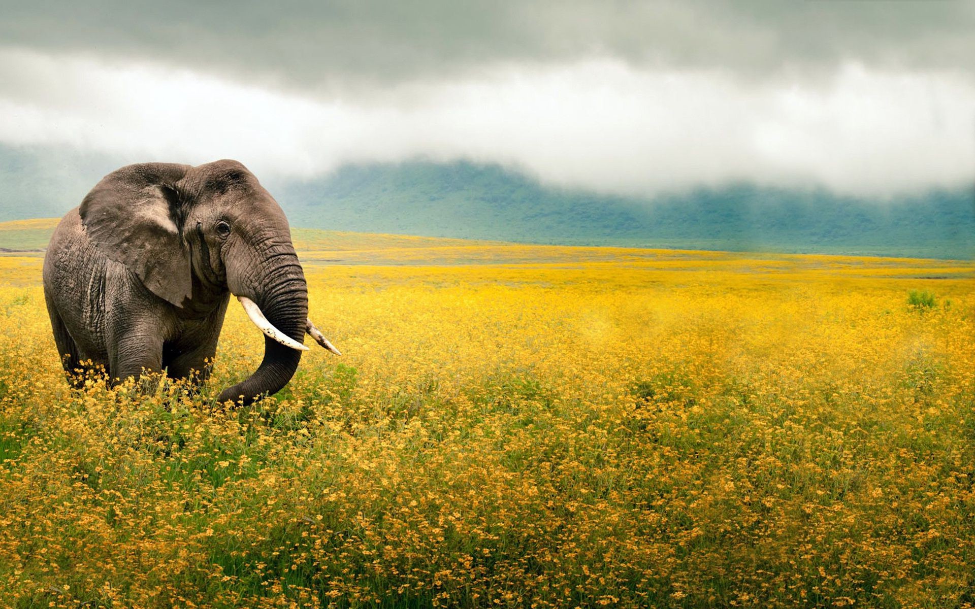 Champ de fleurs éléphant défenses tronc oreilles jaune brouillard