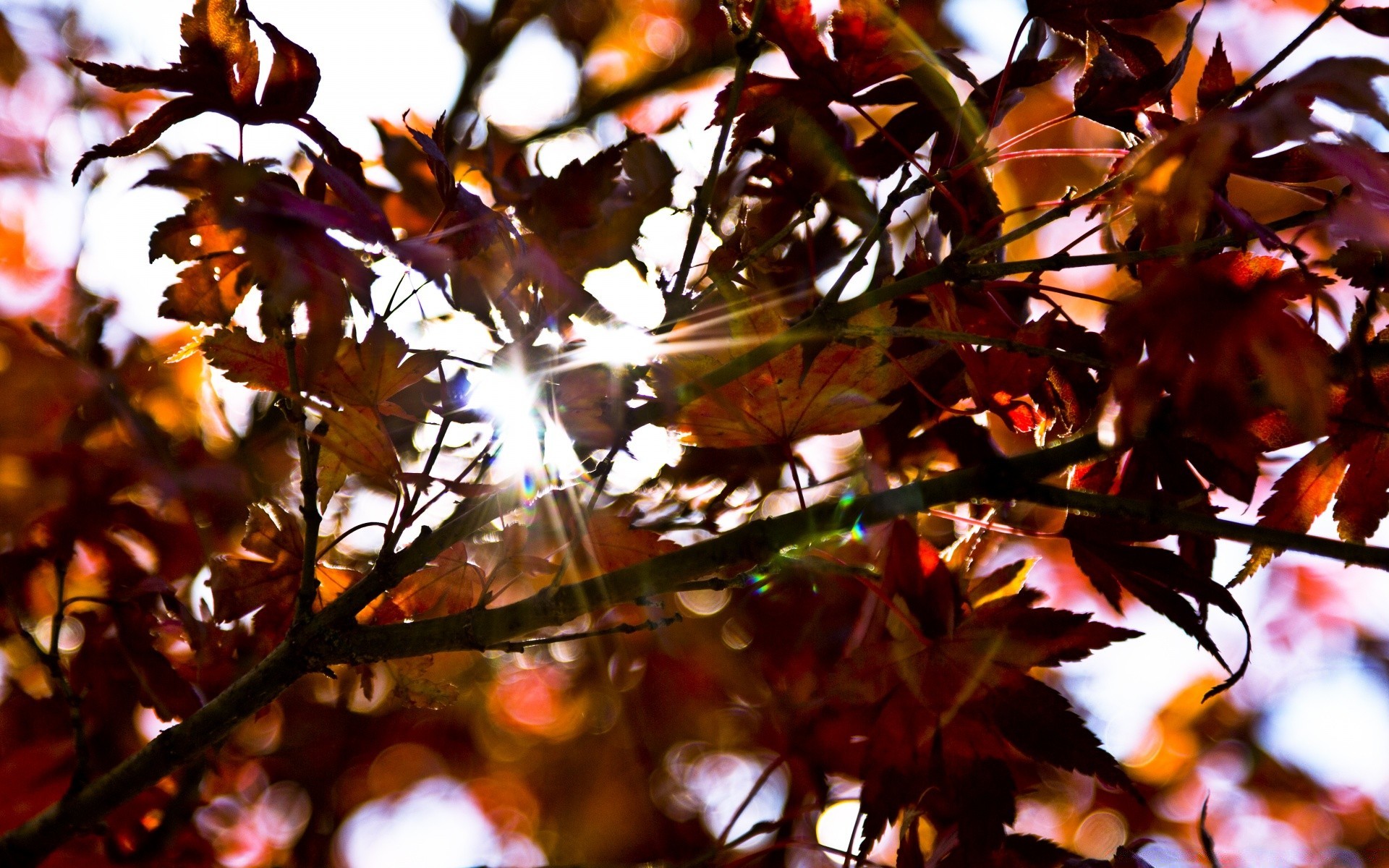 Les rayons du soleil se frayent un chemin à travers les branches des arbres avec des feuilles d'automne