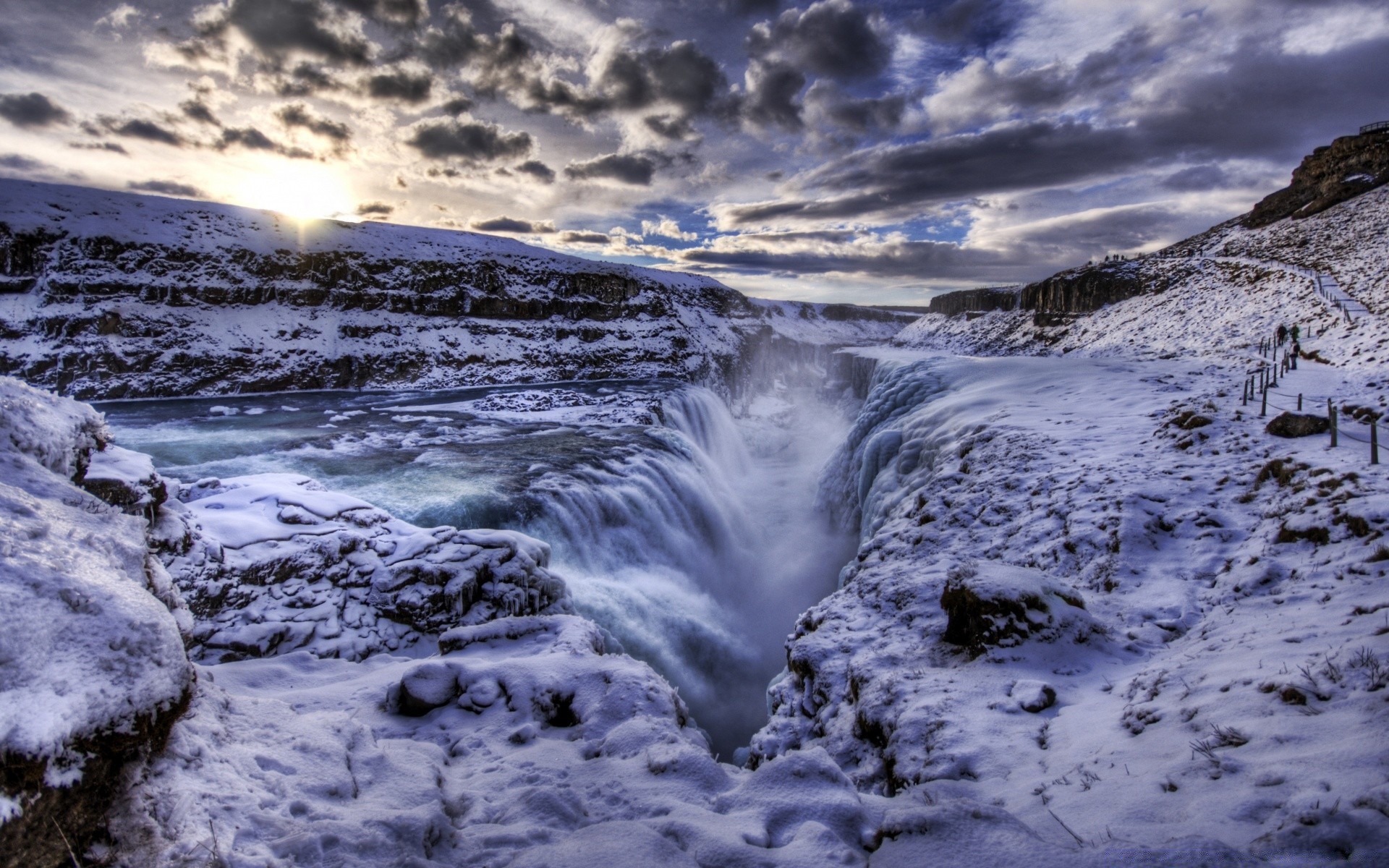 Coucher de soleil glacial reflété dans l'eau de la rivière entourée d'herbes et d'arbres couverts d'iniumCoucher de soleil glacial reflété dans l'eau de la rivière entourée d'herbes et d'arbres couverts d'inium