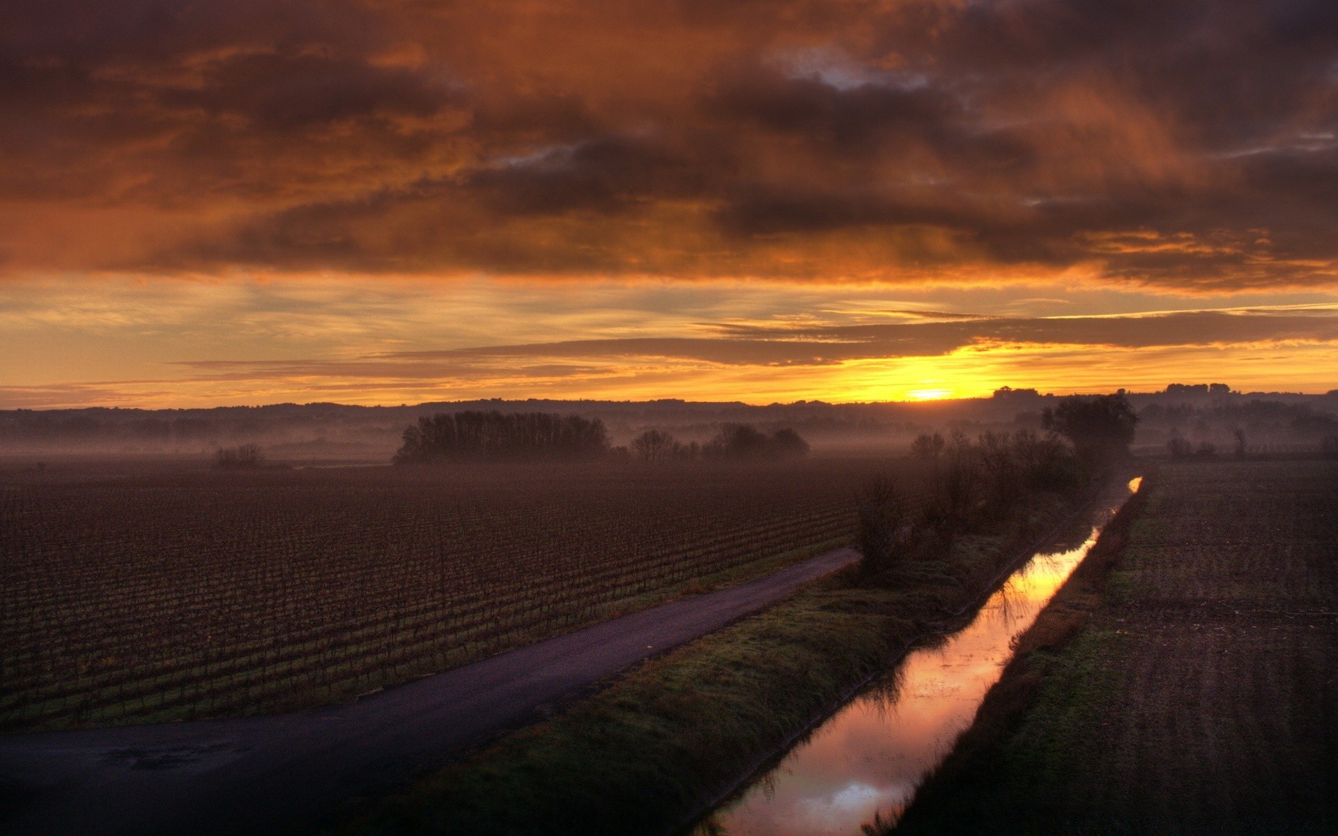 Photo de montagnes dans le brouillard sur fond de coucher de soleil
