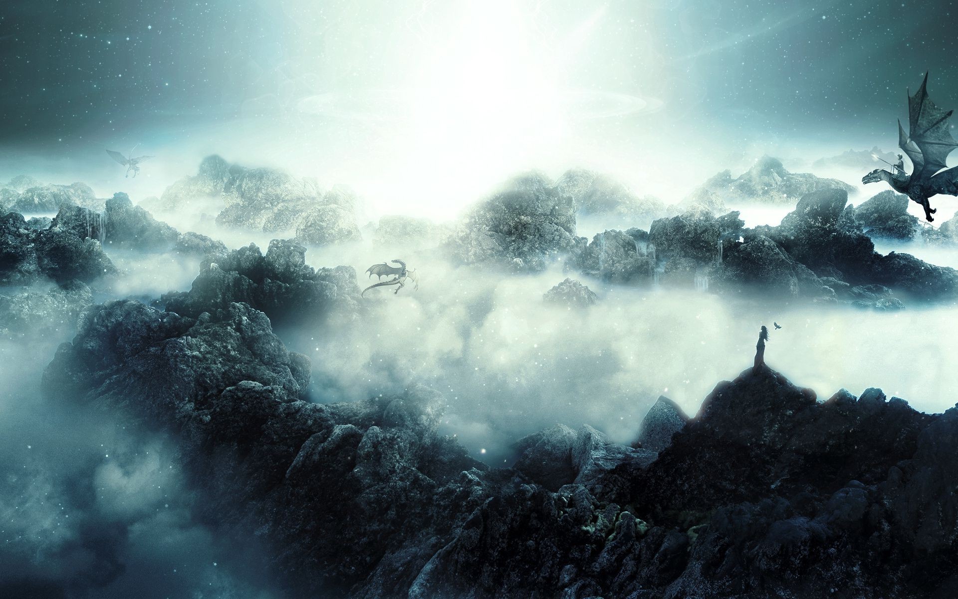 Dragons volent au-dessus des montagnes dans le brouillardDragons volent au-dessus des montagnes dans le brouillard