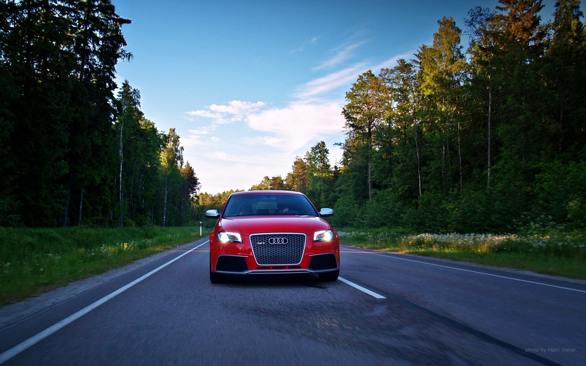 Voiture rouge sur la route sur fond de feuillage et de ciel bleu