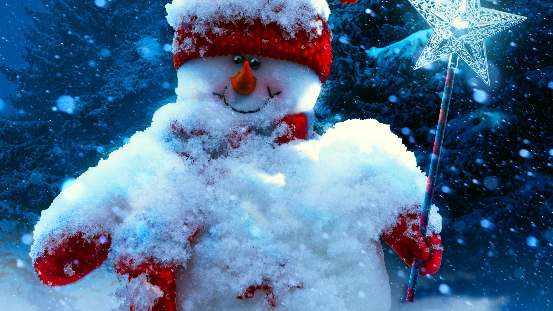 Arbre de Noël, bonhomme de neige et beaucoup de neige