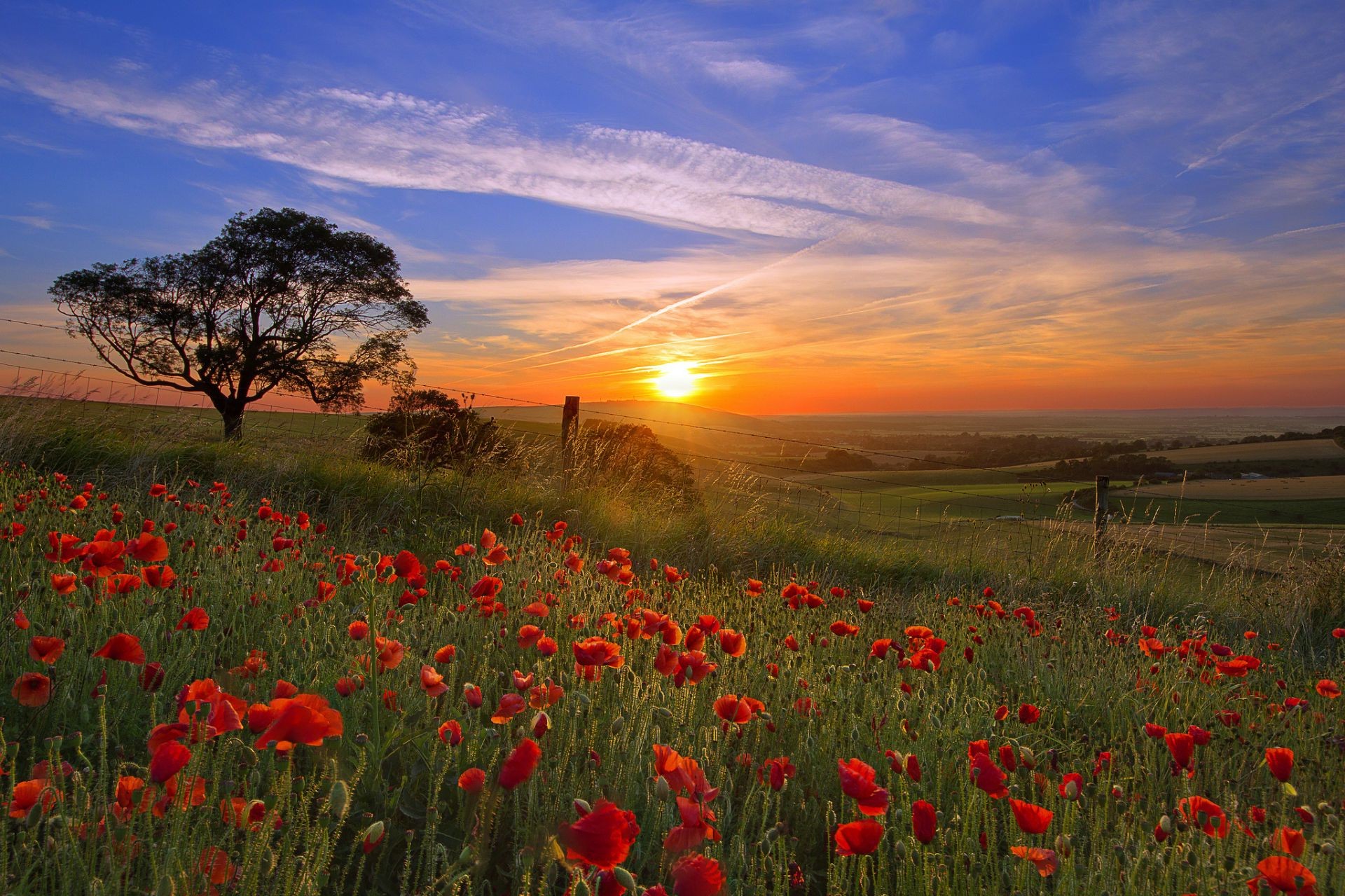 Clairière avec coquelicots rouges sur fond de coucher de soleil