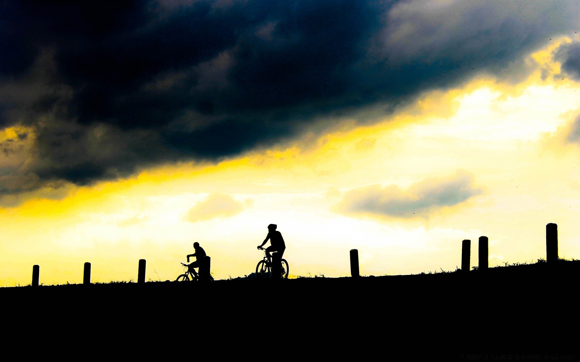 Cyclistes sur fond de coucher de soleil ou de l'aubeCyclistes sur fond de coucher de soleil ou de l'aube