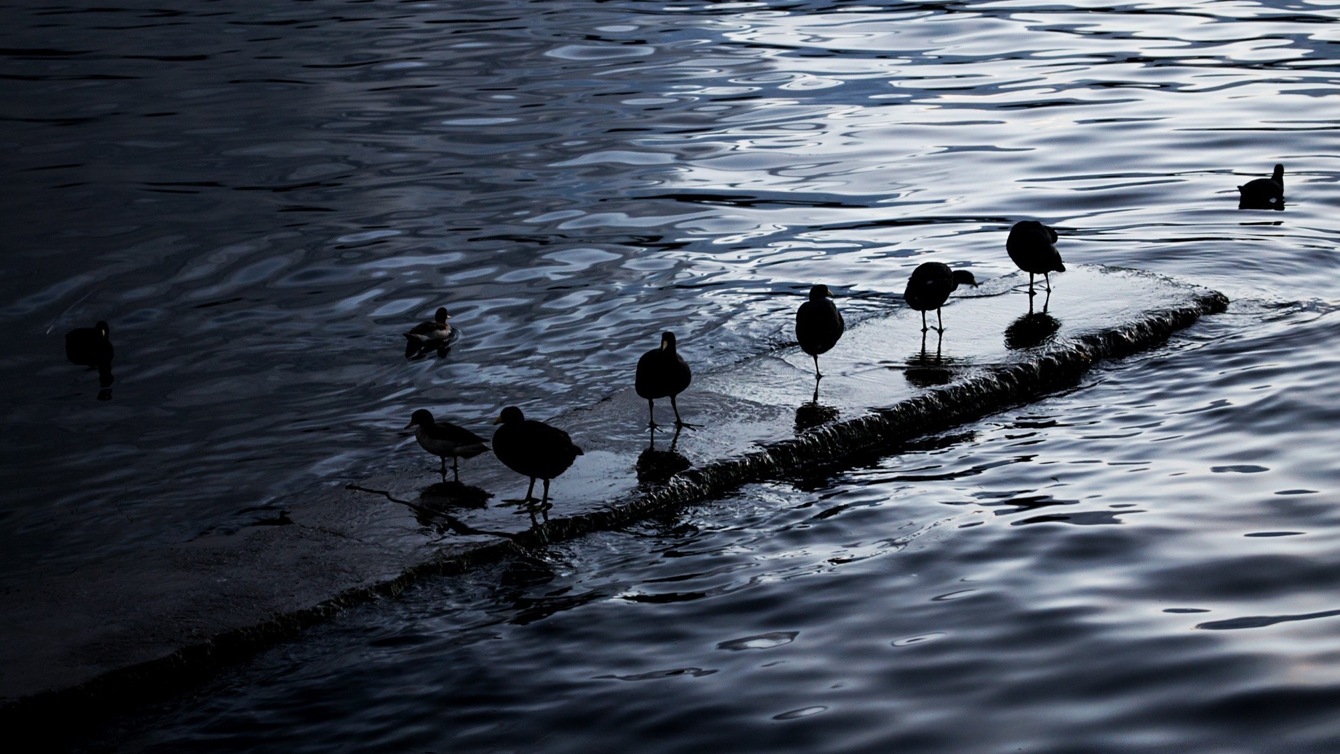 Les canards nagent sur le lac, et ils sont suivis par un chasseur