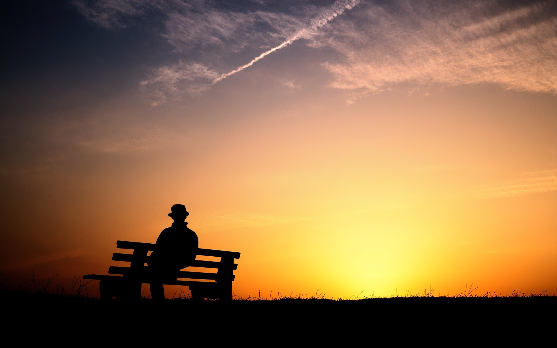 Silhouette d'un homme sur un banc sur fond de coucher de soleilSilhouette d'un homme sur un banc sur fond de coucher de soleil