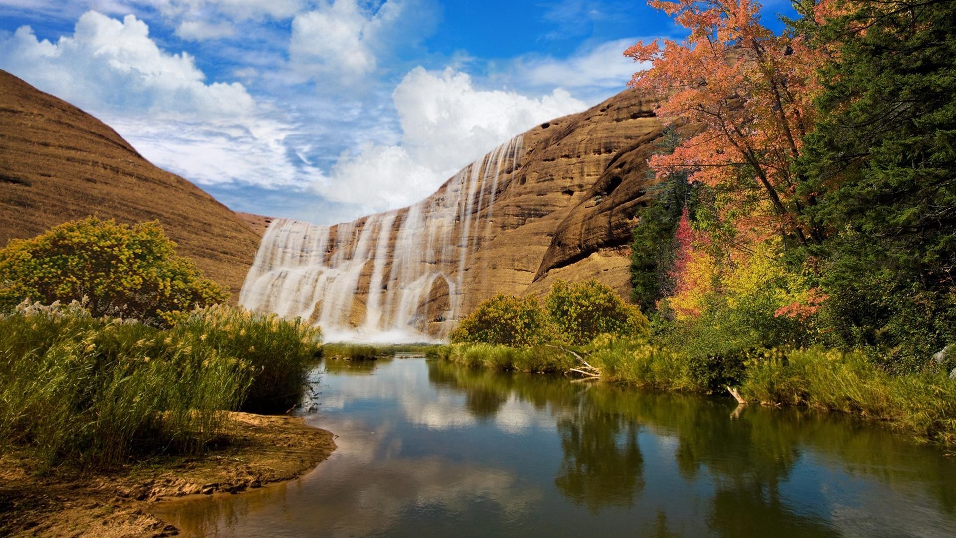 Un ruisseau qui tombe en cascade sur les rochers, un phare solitaire est visible au bord de ce ruisseau