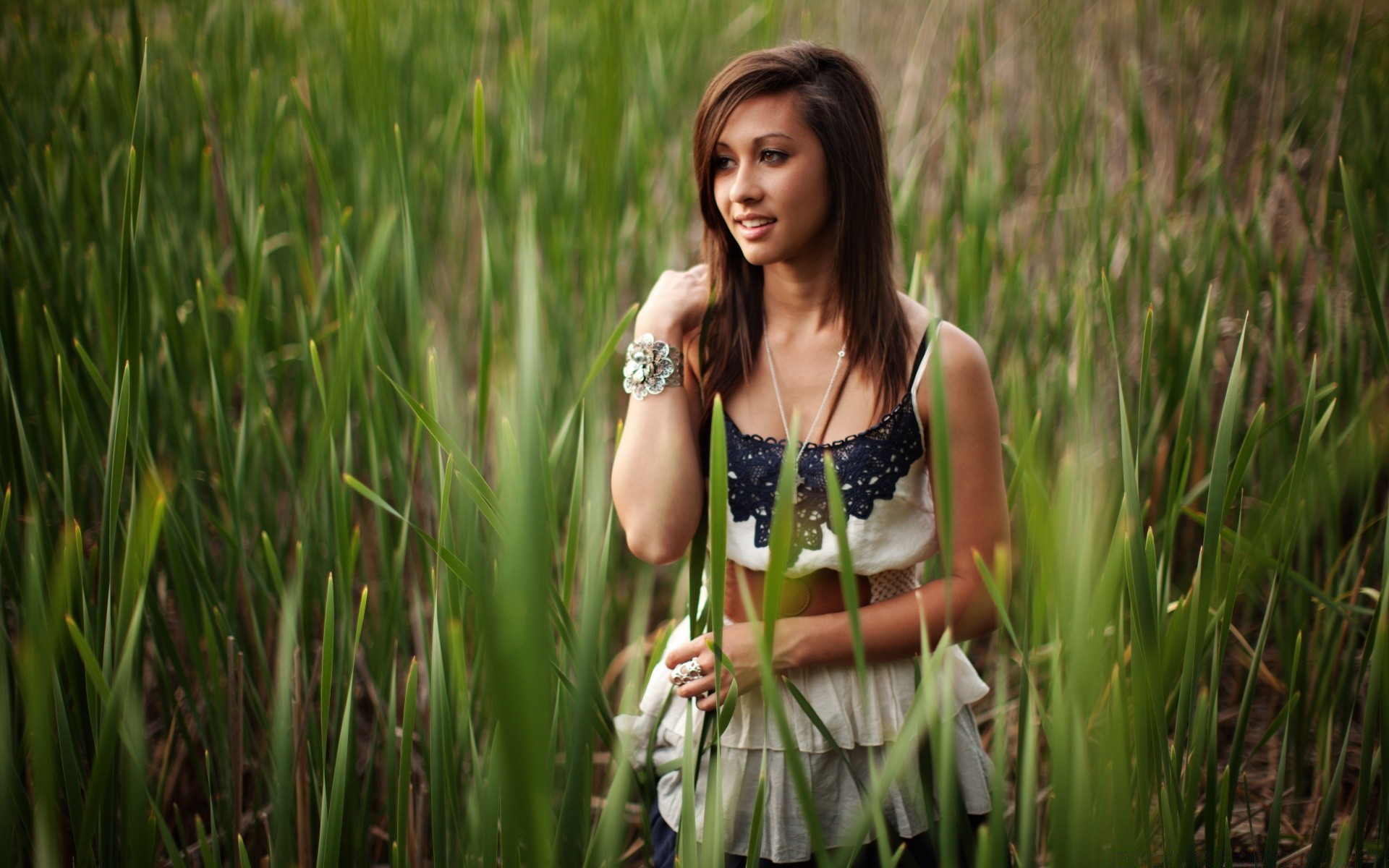 Fille réfléchie se promène parmi les hautes herbes