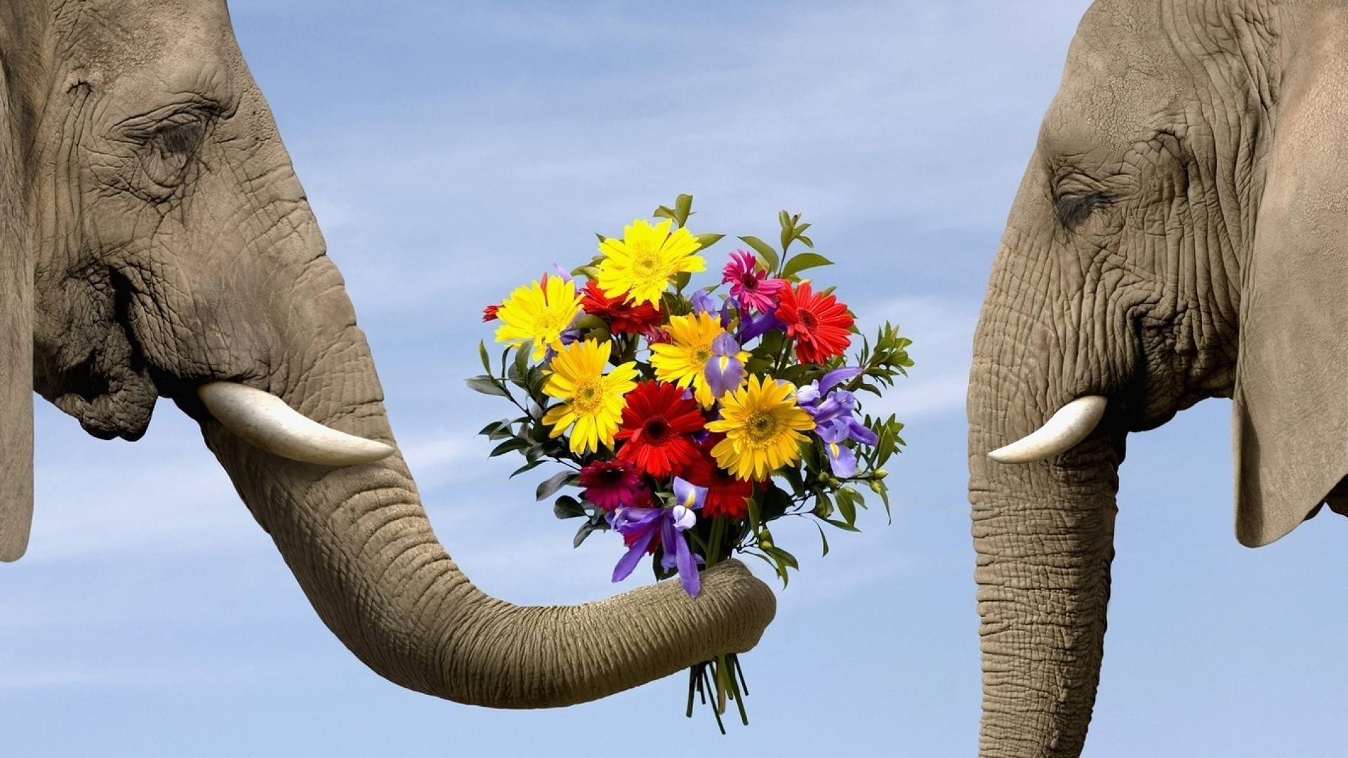 Un éléphant donne un bouquet de fleurs à sa bien-aimée