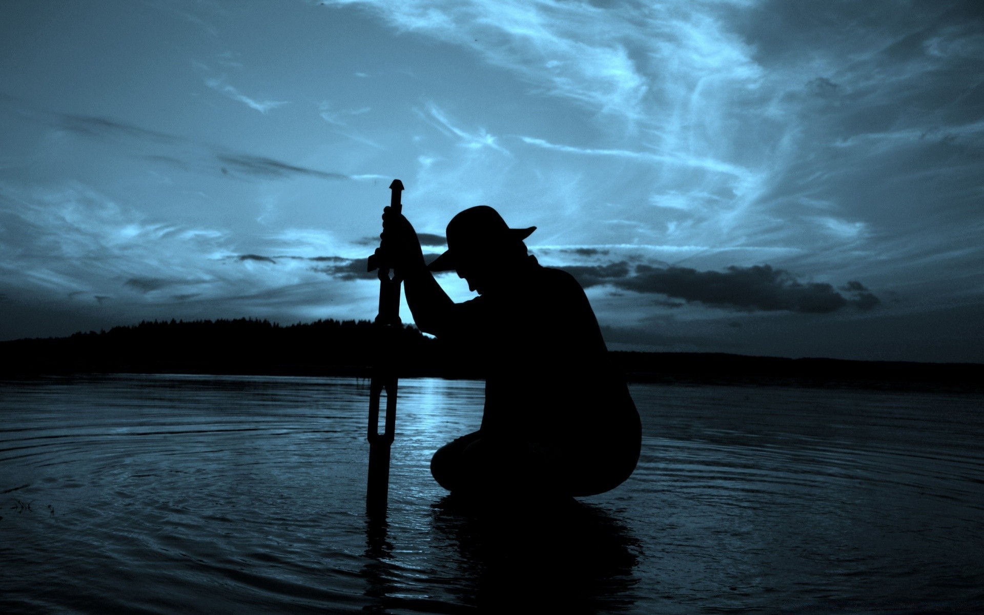 Silhouette d'un homme au chapeau sur fond d'eau et de ciel