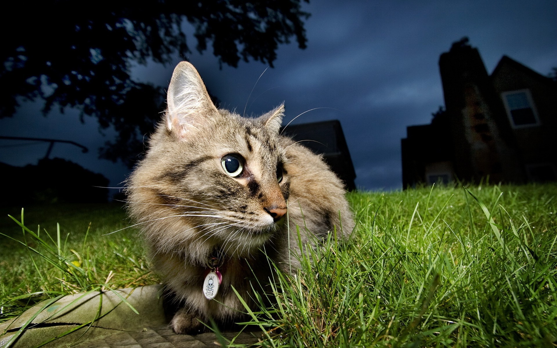 Chat poltergeist sur la pelouse verte