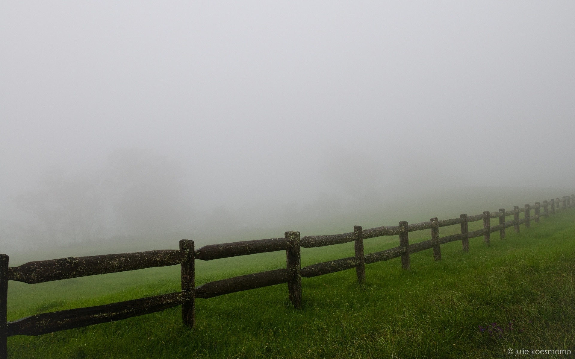 Clôture en bois avec de l'herbe verte dans le brouillard