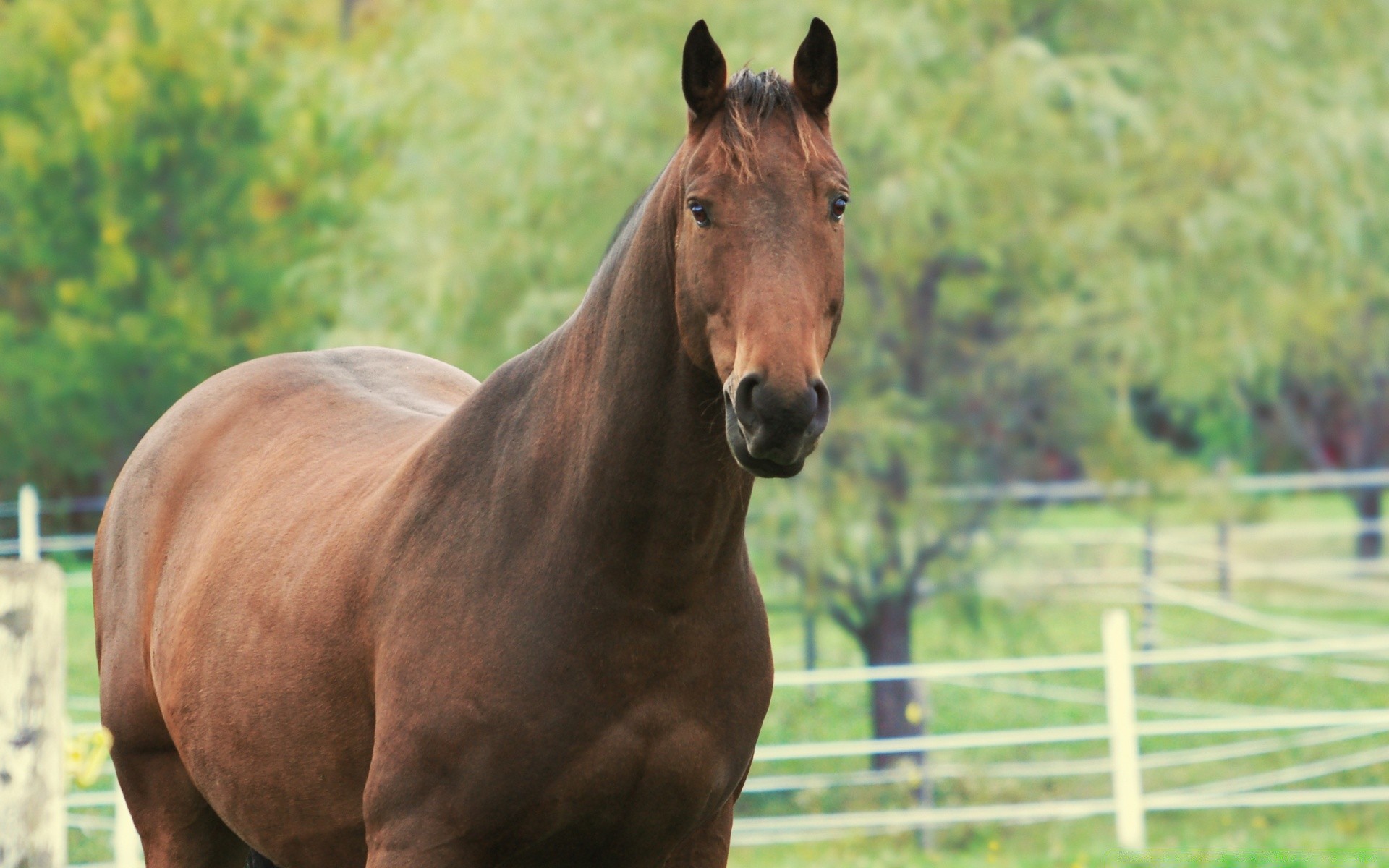 Un cheval roux avec une tache blanche sur la tête se tient dans un enclos sur la pelouse