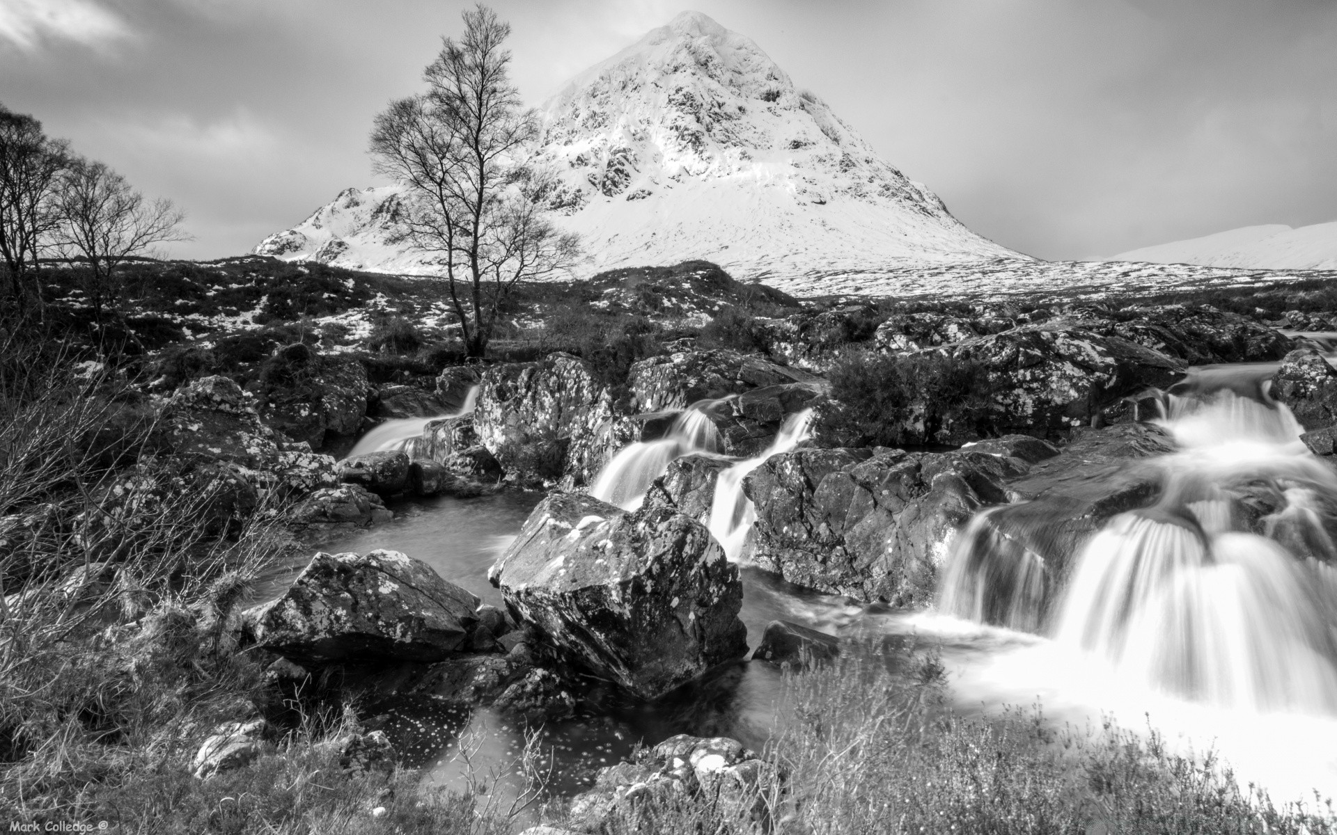 Paysage de l'eau dans les montagnes en noir et blanc