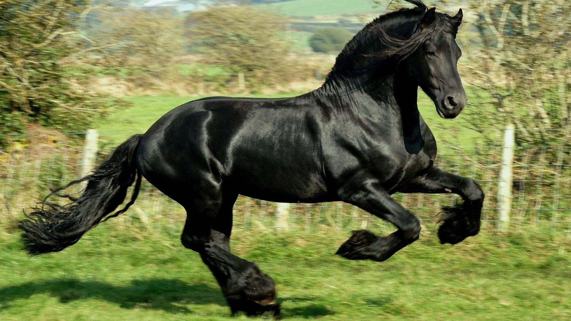 Un étalon noir court sur une Prairie verte