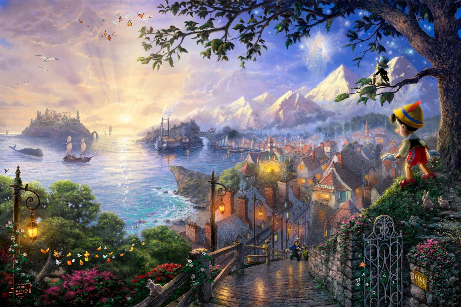 Un dirigeable fantastique survole la mer au coucher du soleil