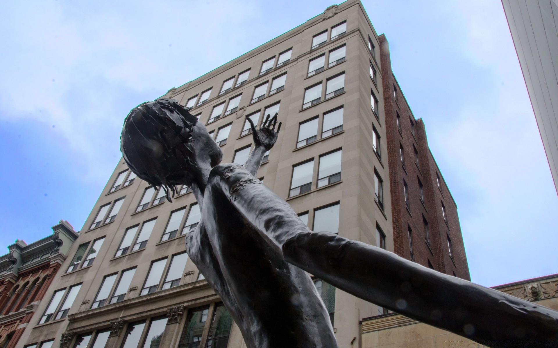 Sculpture d'un homme sur fond de gratte-ciel