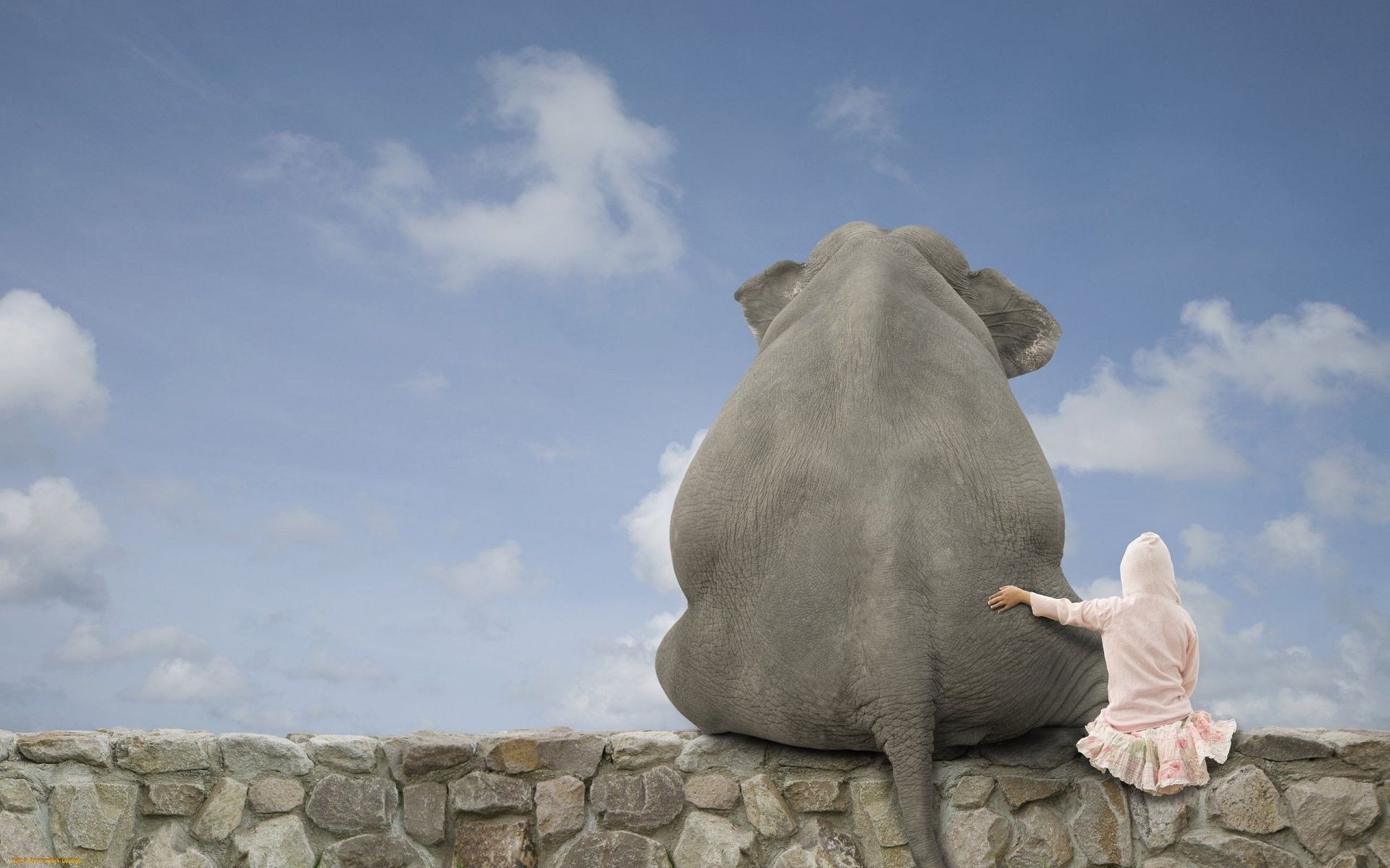 Fille dans une étreinte avec un éléphant sur fond de ciel